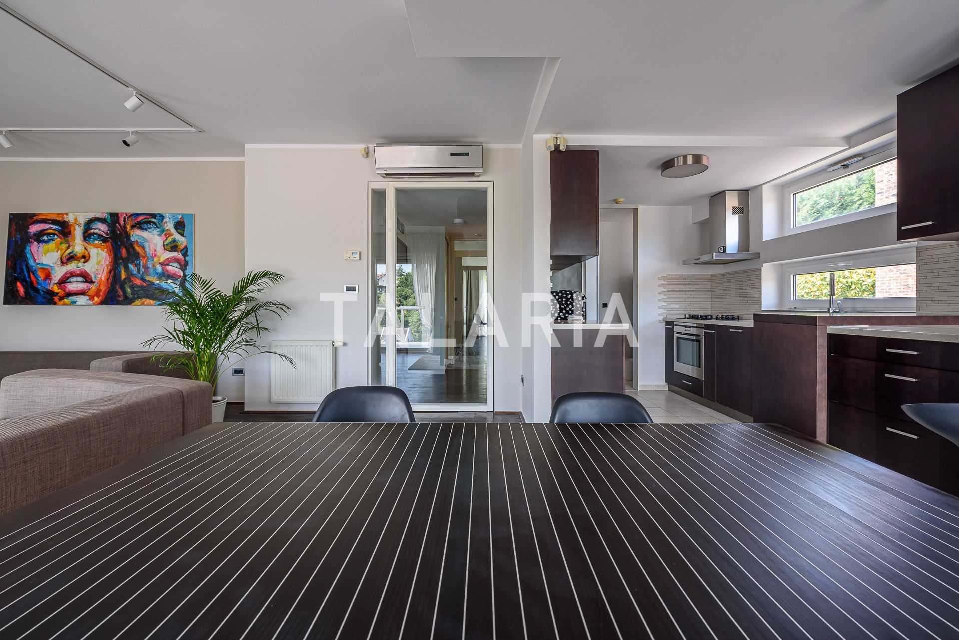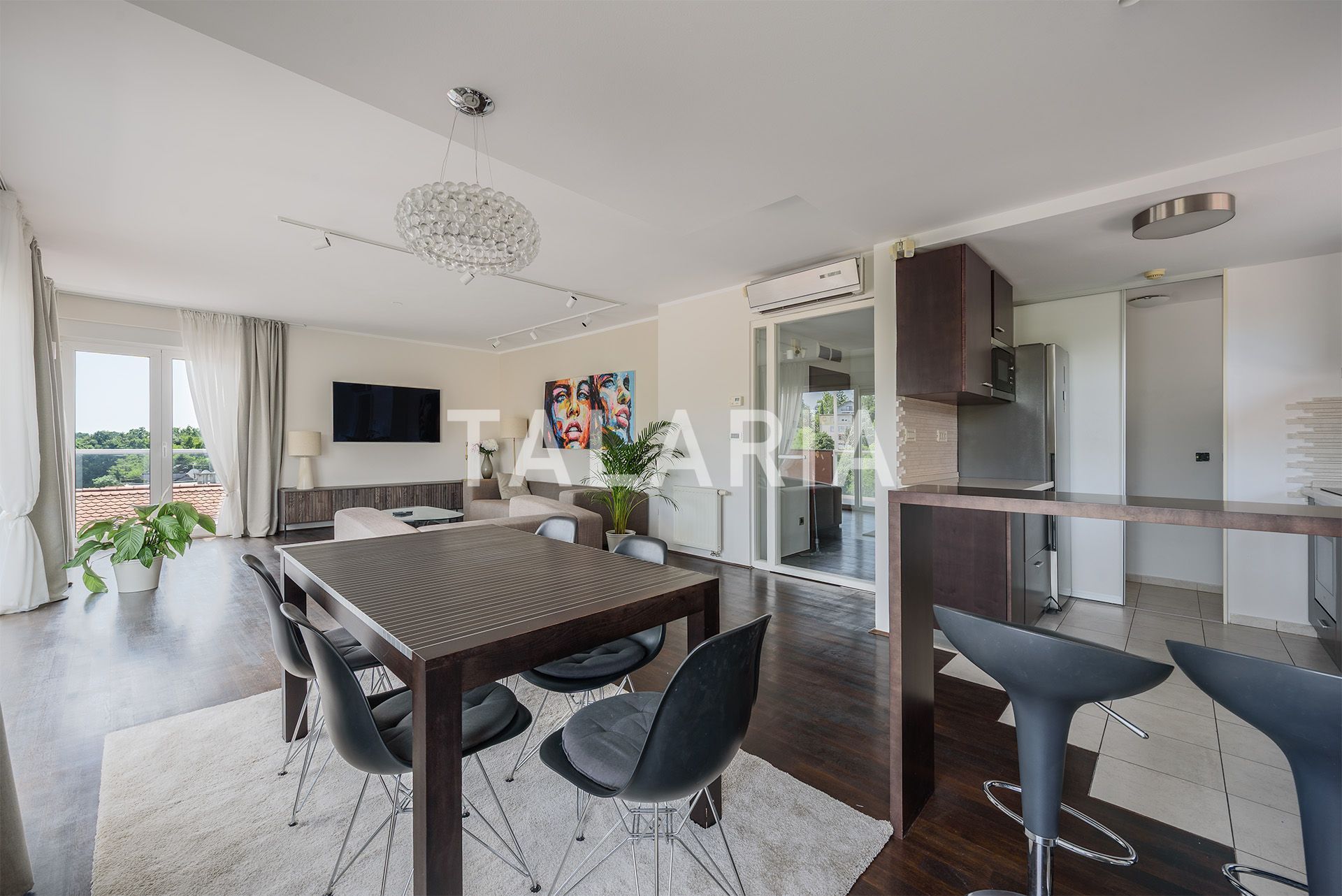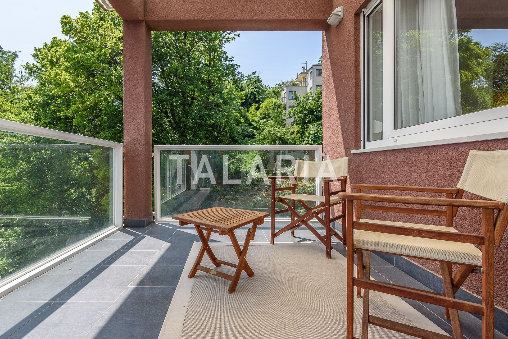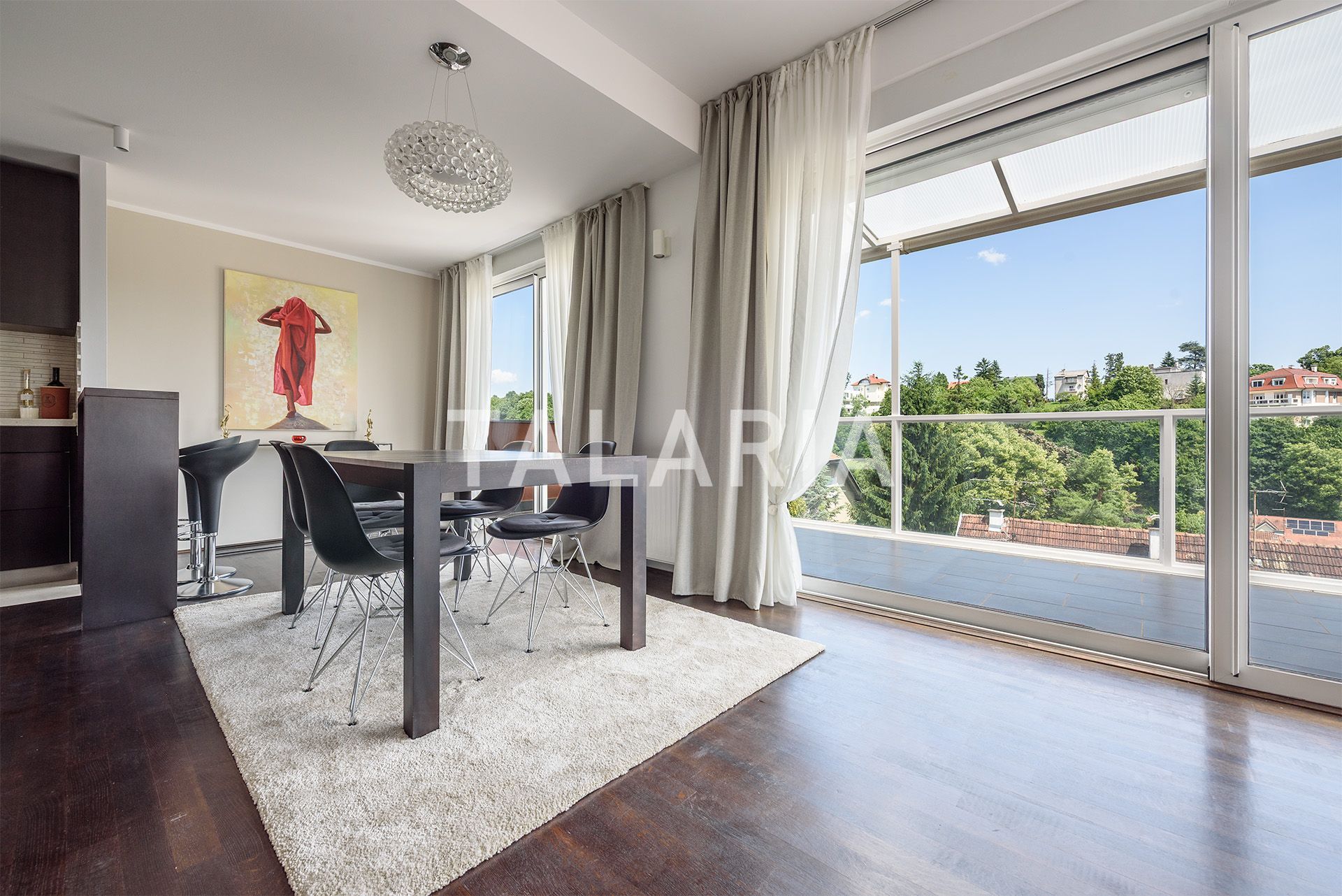A beautiful penthouse in a small urban villa, spanning the entire floor and open to all four sides. The floor plan is excellently organized. The entrance in the middle of the apartment leads us to a hallway with a wardrobe and a guest toilet, from which on the left we go to the intimate part of the apartment with 3 bedrooms and a bathroom (bathtub). Two rooms share a beautiful covered terrace. The right side of the hallway opens onto a beautiful living room connected to the dining room and kitchen. This open plan space is surrounded by glass walls that continue onto a beautiful covered terrace oriented to the east and south, with a magical open view of the forest. The apartment has a double garage and a storage room in the basement. Excellent apartment and building. Quality construction, aluminum windows and joinery, quiet street. Agency recommendation.