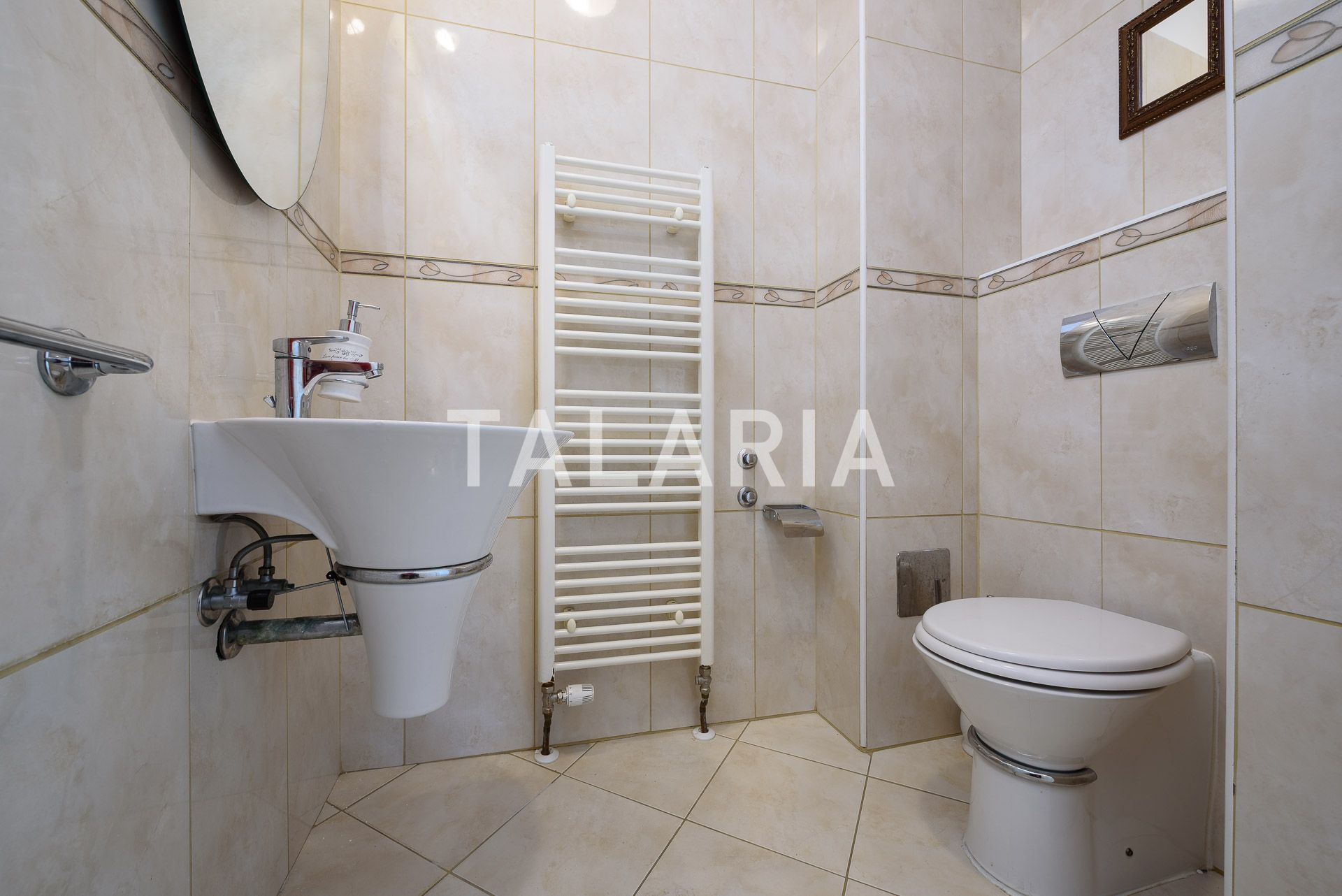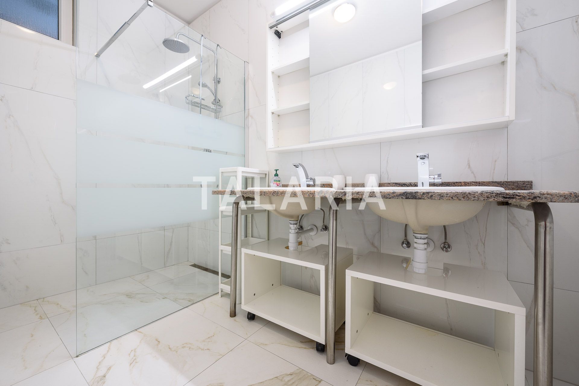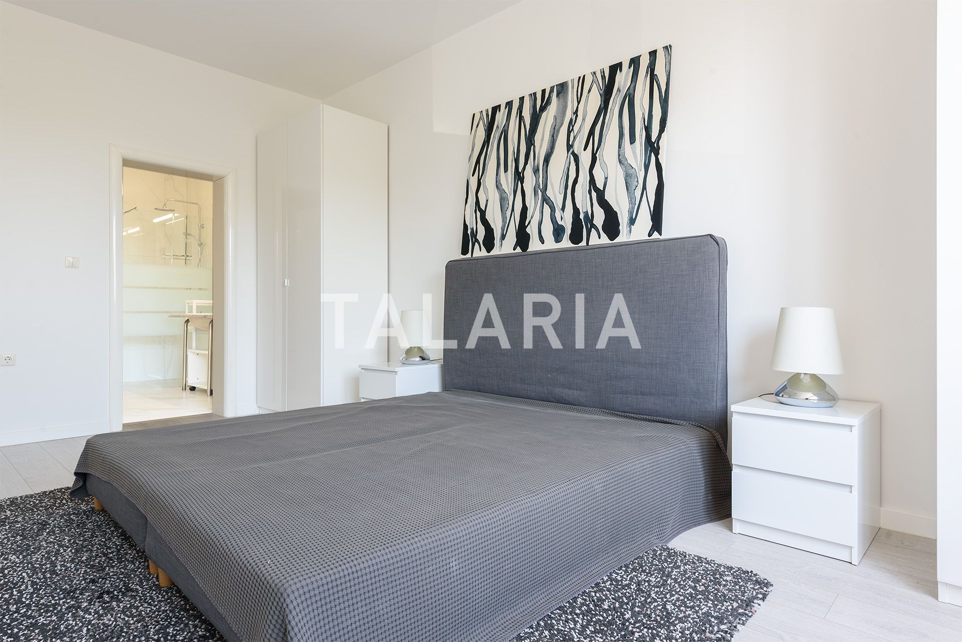 This modern apartment is located in a peaceful neighborhood and has a total area of 170m². It consists of an entrance hallway with built-in wardrobes, a spacious living room with access to a covered terrace, 3 comfortable bedrooms, 3 bathrooms, a dining area, a kitchen, a storage room, and a walk-in closet. The apartment comes with one garage parking space.