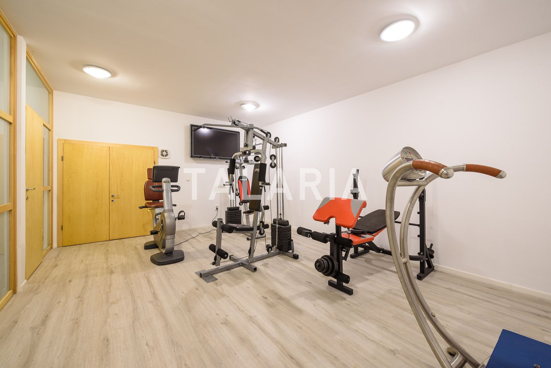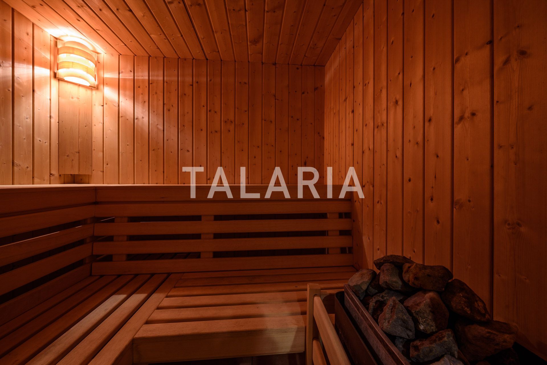 Residents have access to a covered outdoor gazebo with a barbecue, an additional toilet, a garden, a swimming pool, as well as a sauna and a gym located within the building.