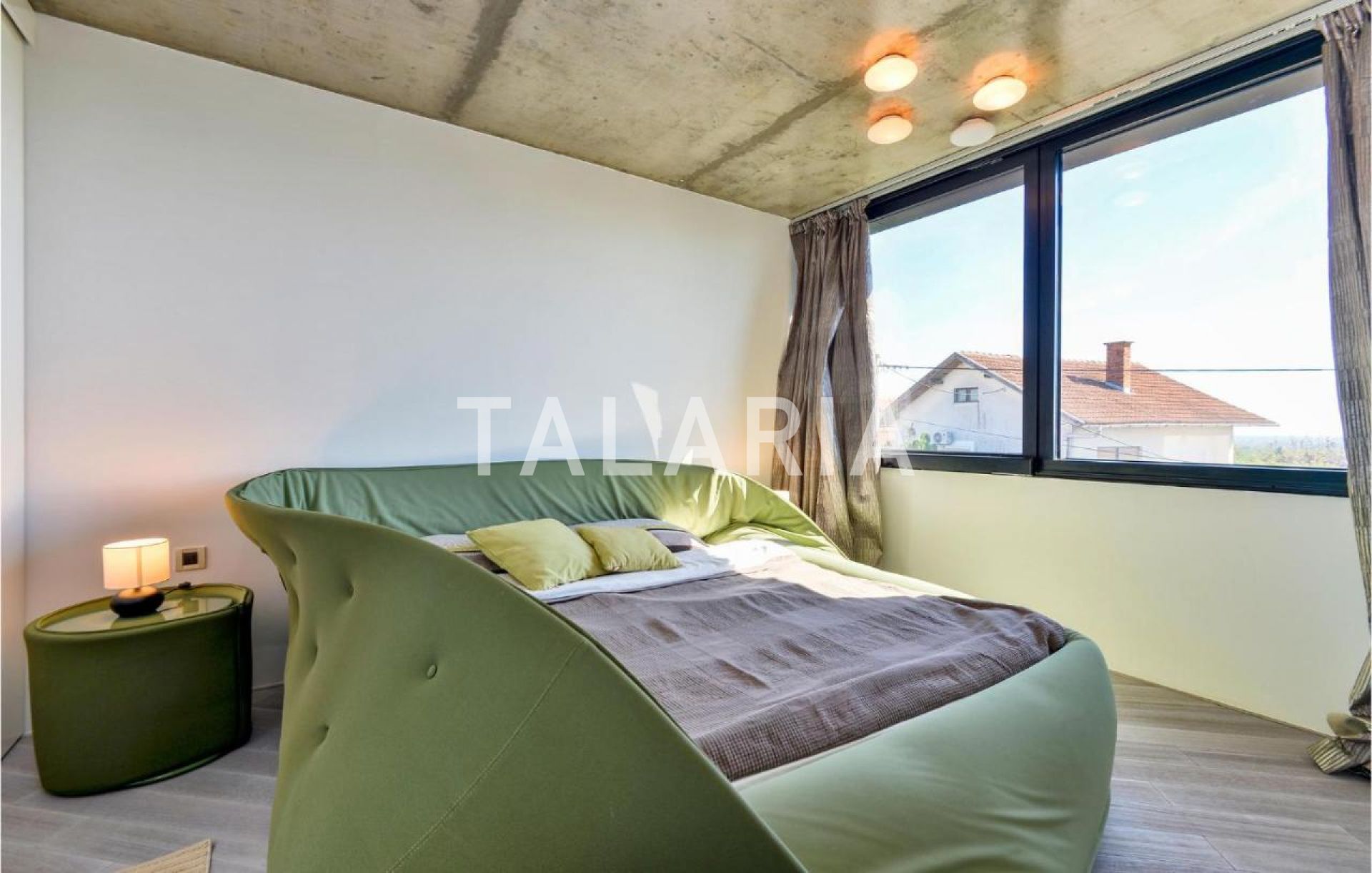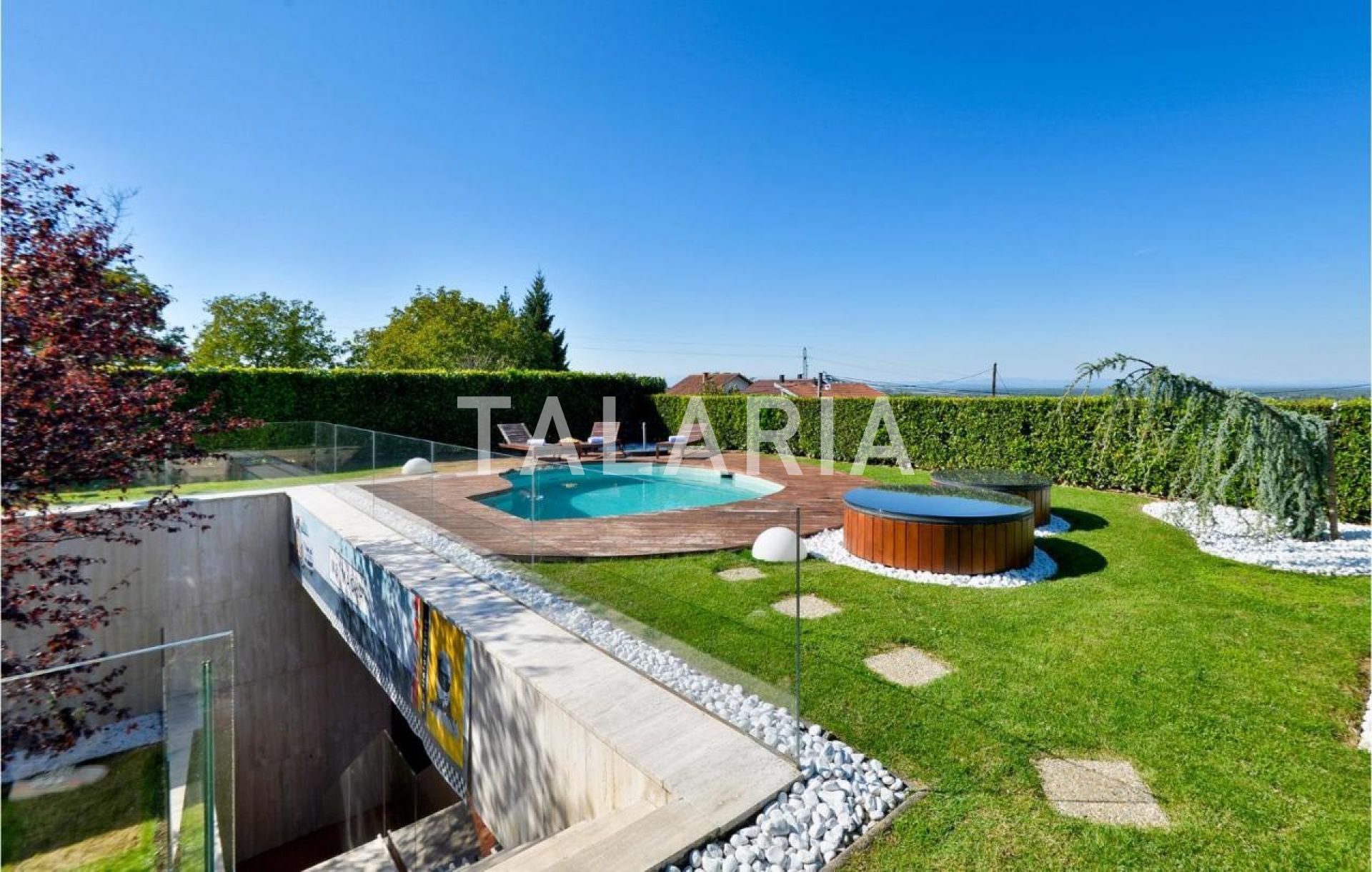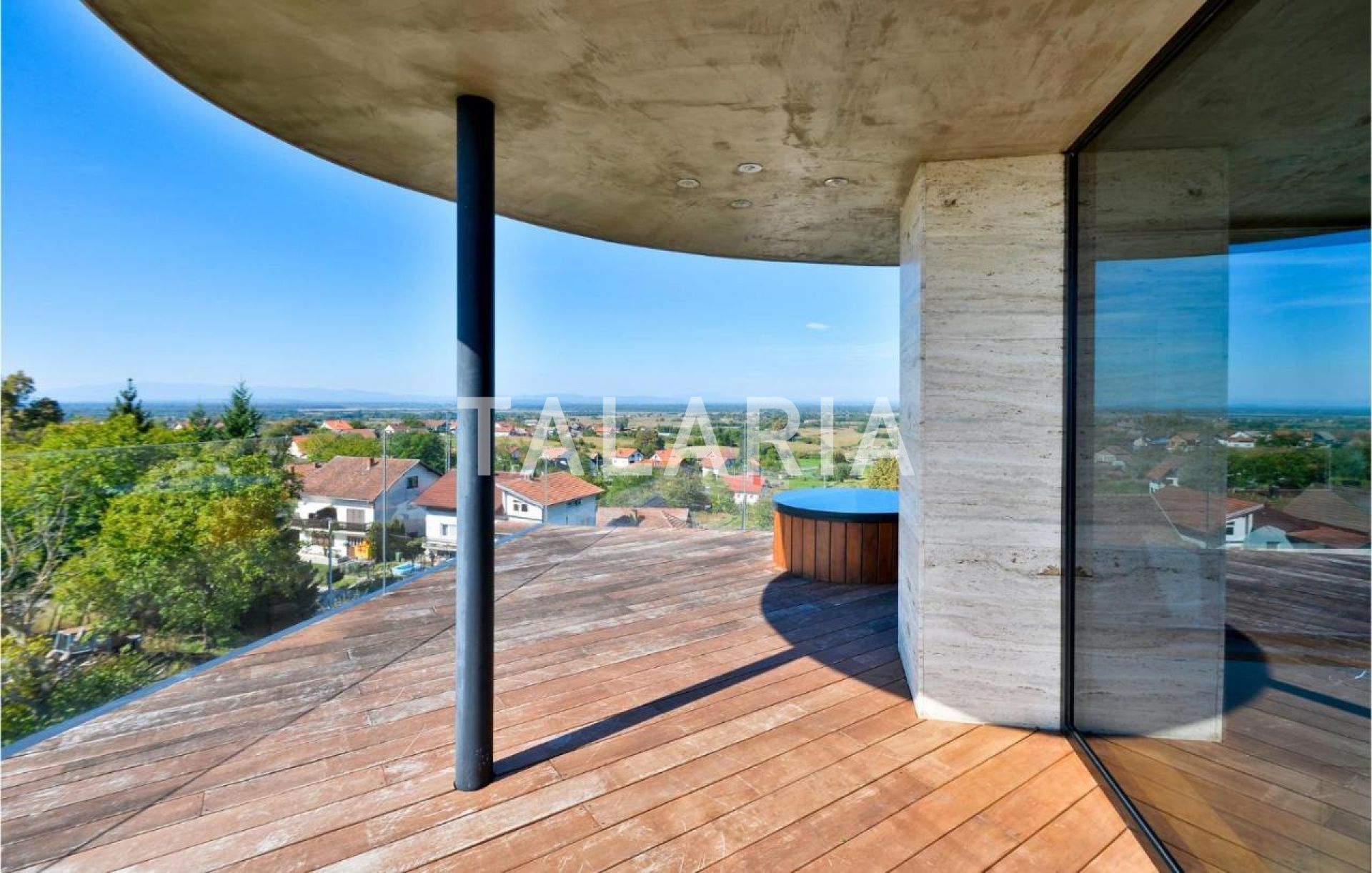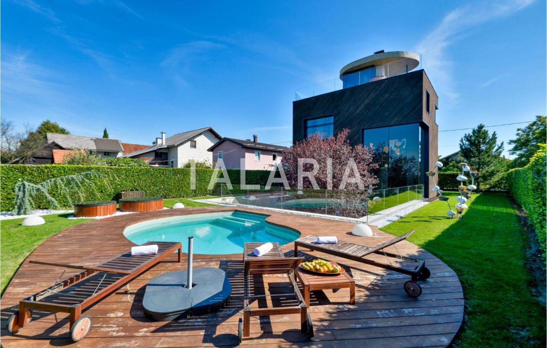 Luxurious, modern house of 273m2 with a swimming pool in Kloštar Ivanić. It is spread over 634m2 of land. It consists of 3 floors, on the 1st floor is: a kitchen with dining room, a study room, a bathroom with a toilet and a sauna, on the 2nd floor: a kitchen with a dining room, a spacious living room and a guest toilet, on the mezzanine floor there is a bedroom and a bathroom with a hydromassage bath, and on the 3rd floor: 2 bedrooms and a bathroom with a toilet. You can also enjoy it on the roof of the house, where there is a large terrace with a beautiful view and a jacuzzi. The house has a garage and a parking space, it is equipped with the highest quality appliances.