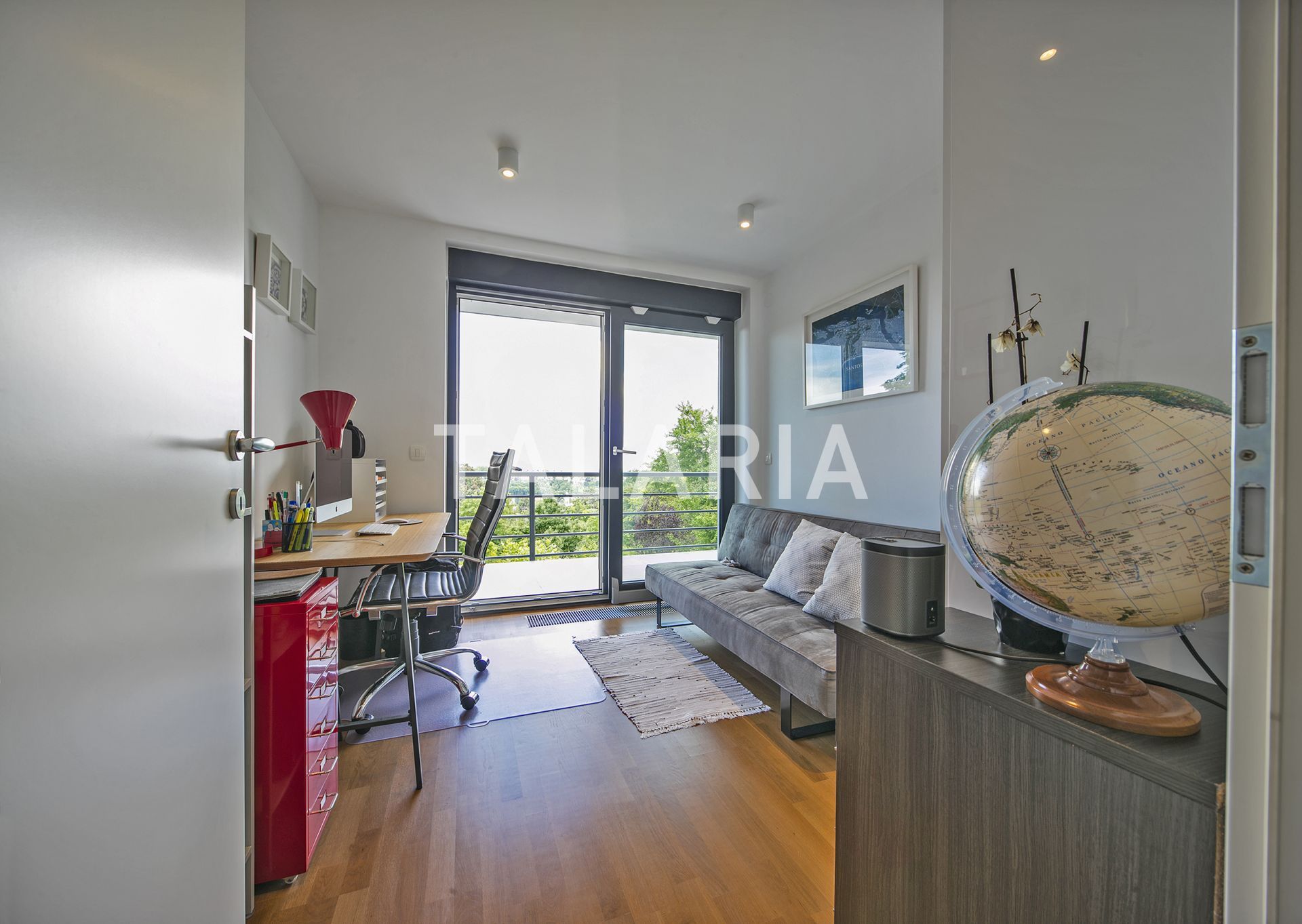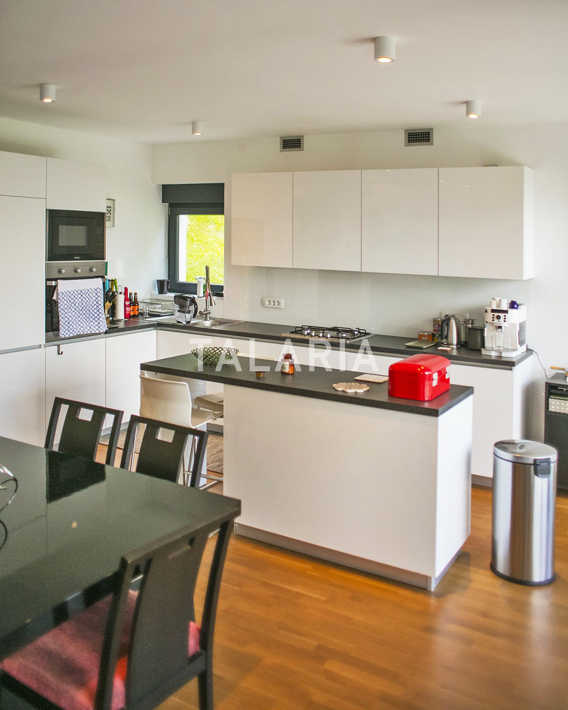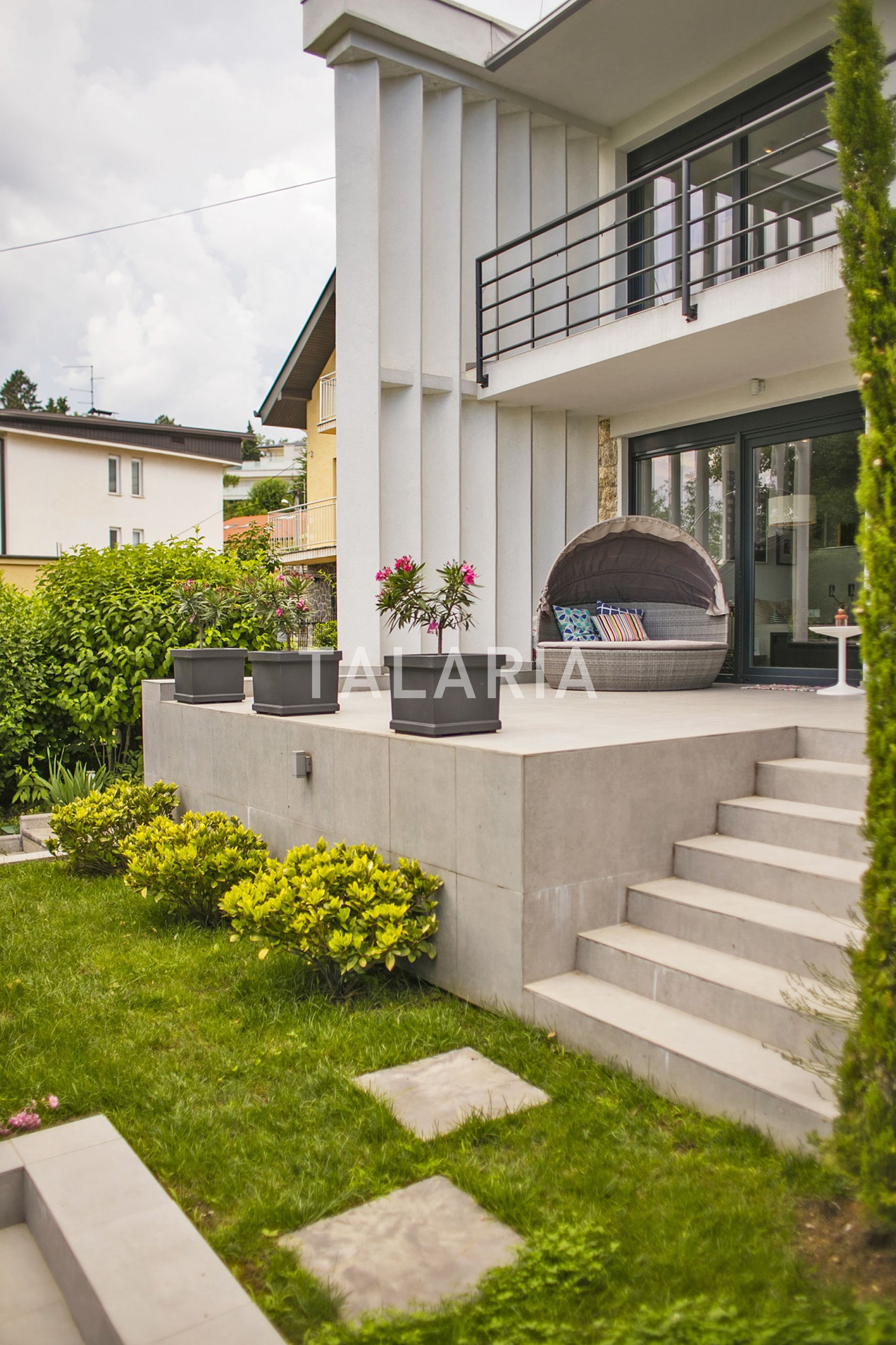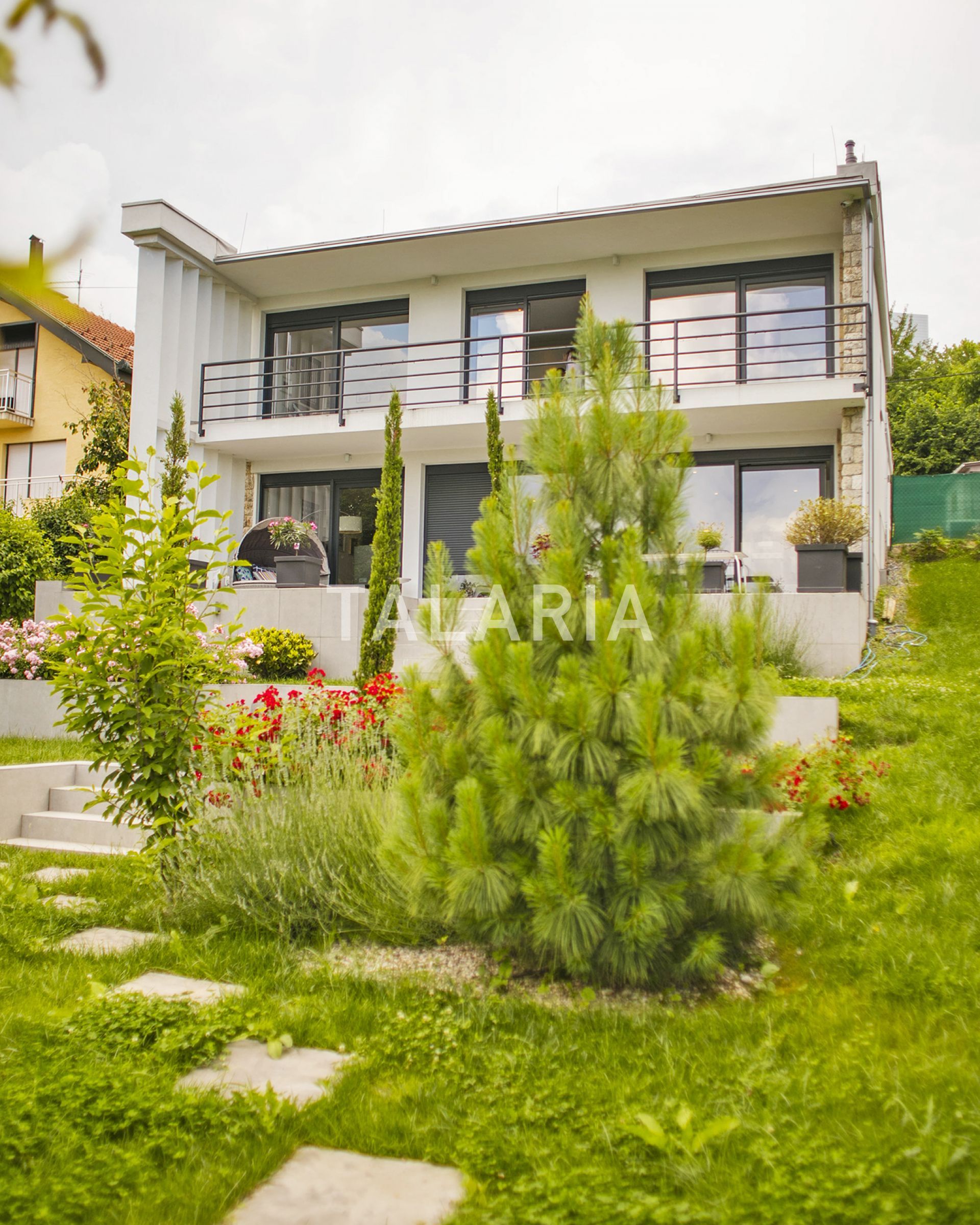 A modern, luxuriously furnished small villa with a beautiful garden is located in a quiet street just 10 minutes from the city and the bustle. The magical, small but rich garden gives it an extra dimension and a relaxing atmosphere. Beautiful family-friendly house, spread over 2 floors. The ground floor consists of entrance hall, magical open space living room with dining area and kitchen, spacious terrace with access to a beautiful garden, guest toilet, gym with jacuzzi and Finnish sauna and laundry room with storage. Upstairs are 3 bedrooms, 2 bathrooms, large covered balcony. Open view. Quiet street. The house has outdoor parking and a large garage with direct entrance to the house. It is rented unfurnished, for a longer period of time.
