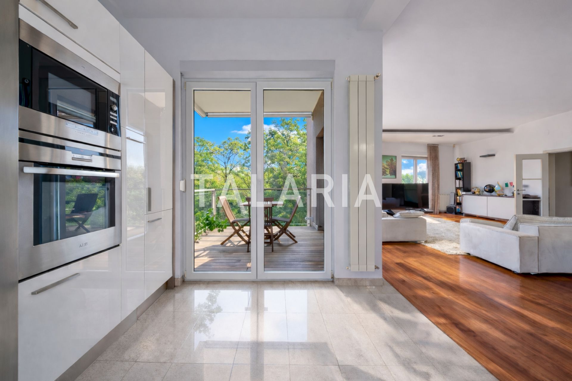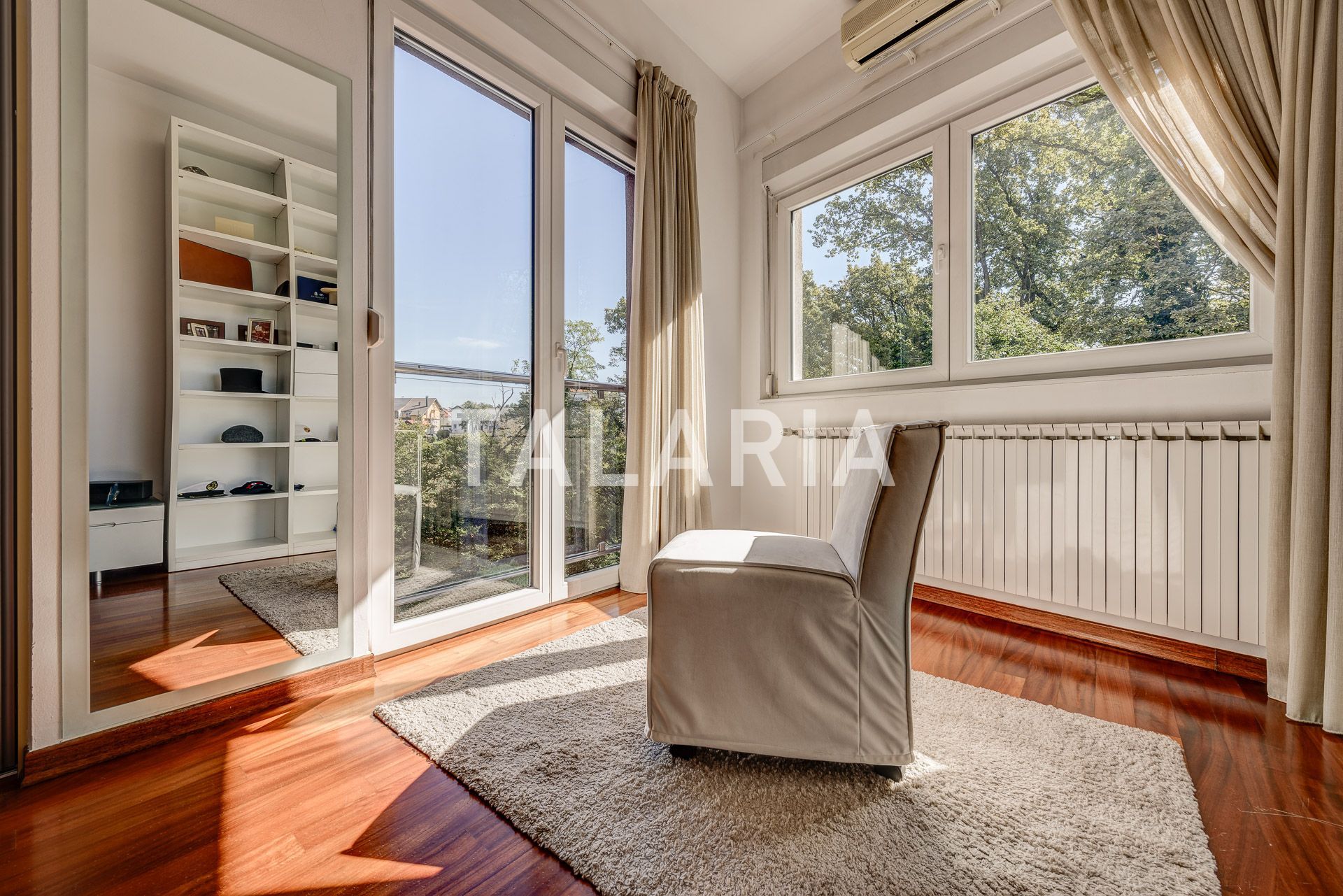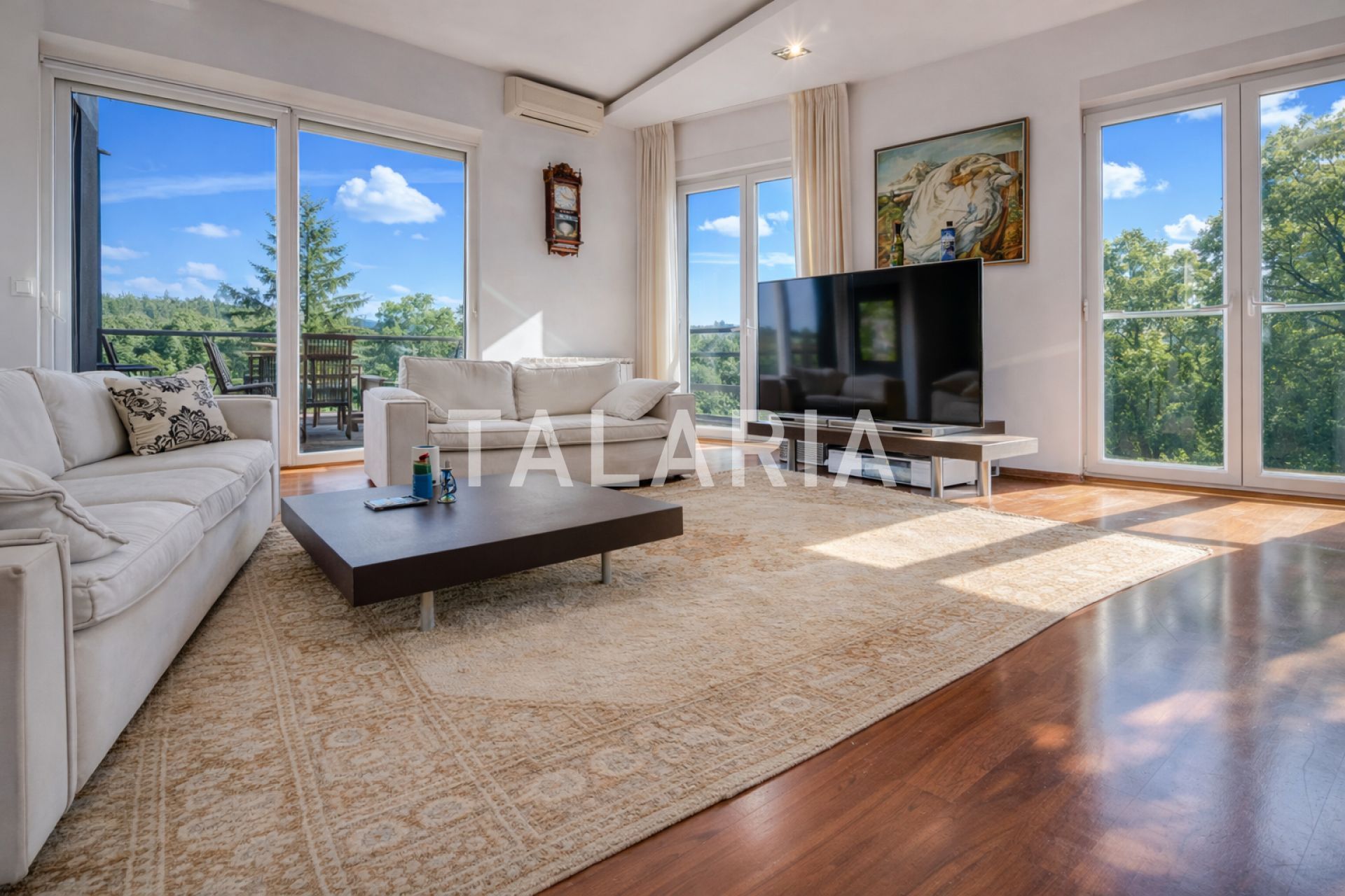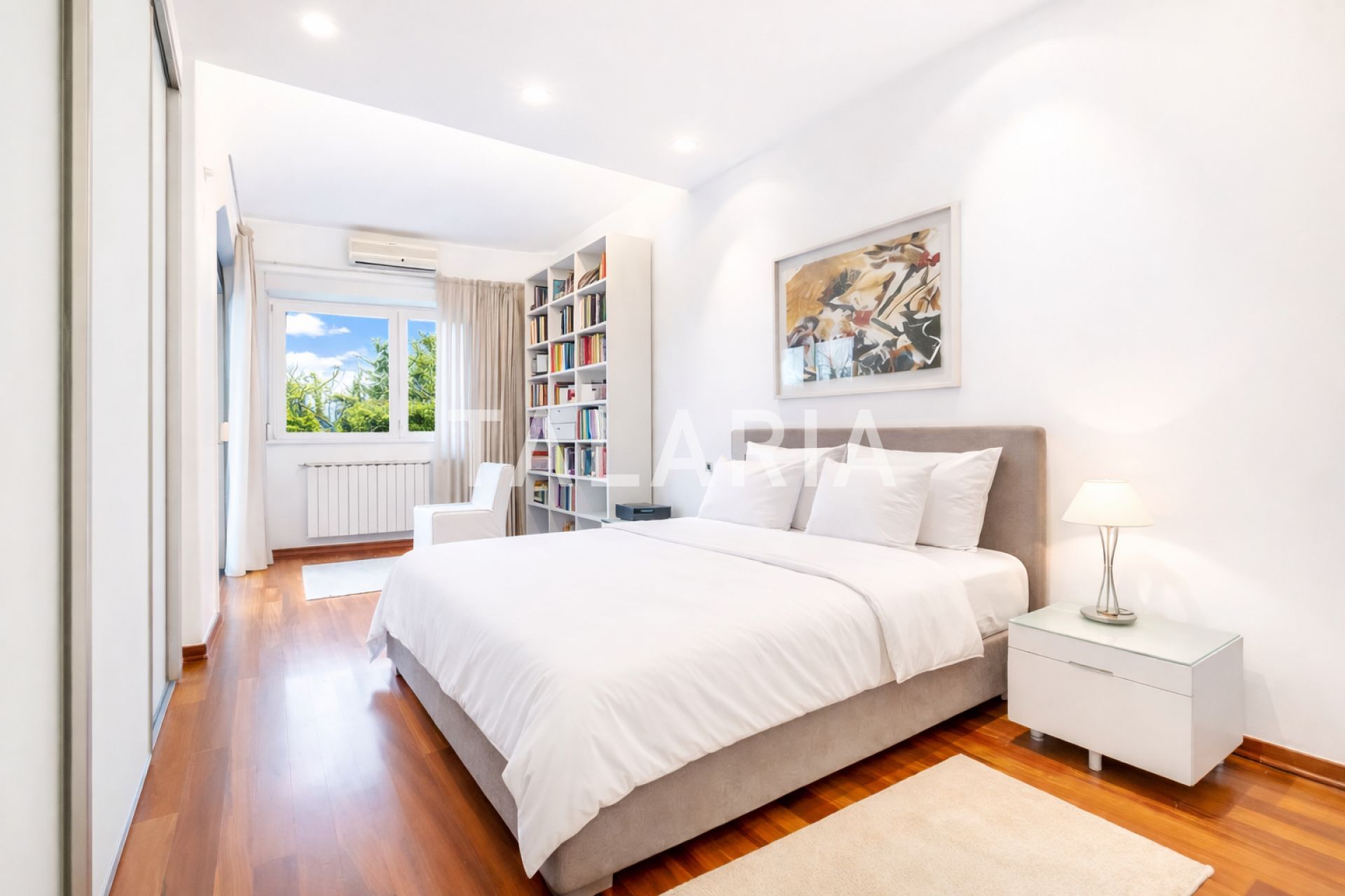 Luksuzan 4-sobni stan okružen zelenilom, sastoji se od prostranog dnevnog boravka sa blagovaonom/kuhinjom i izlazom na terasu (10m2), 3 spavaće sobe, garderobe, kupaonice i gostinjskog WC-a. Opremljen visoko kvalitetnim materijalima, klimatiziran, alarmni sustav, električni podizači roleta, podno grijanje (kupaonica), video portafon, vinski hladnjak, jacuzzi kada, vrhunska HI-FI tehnika. Stan ima dvoetažnu garažu za 2 automobila.
