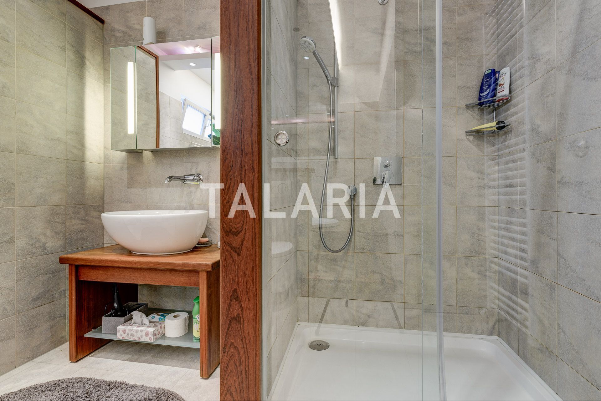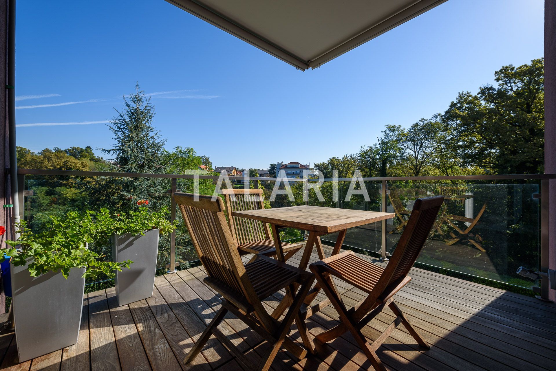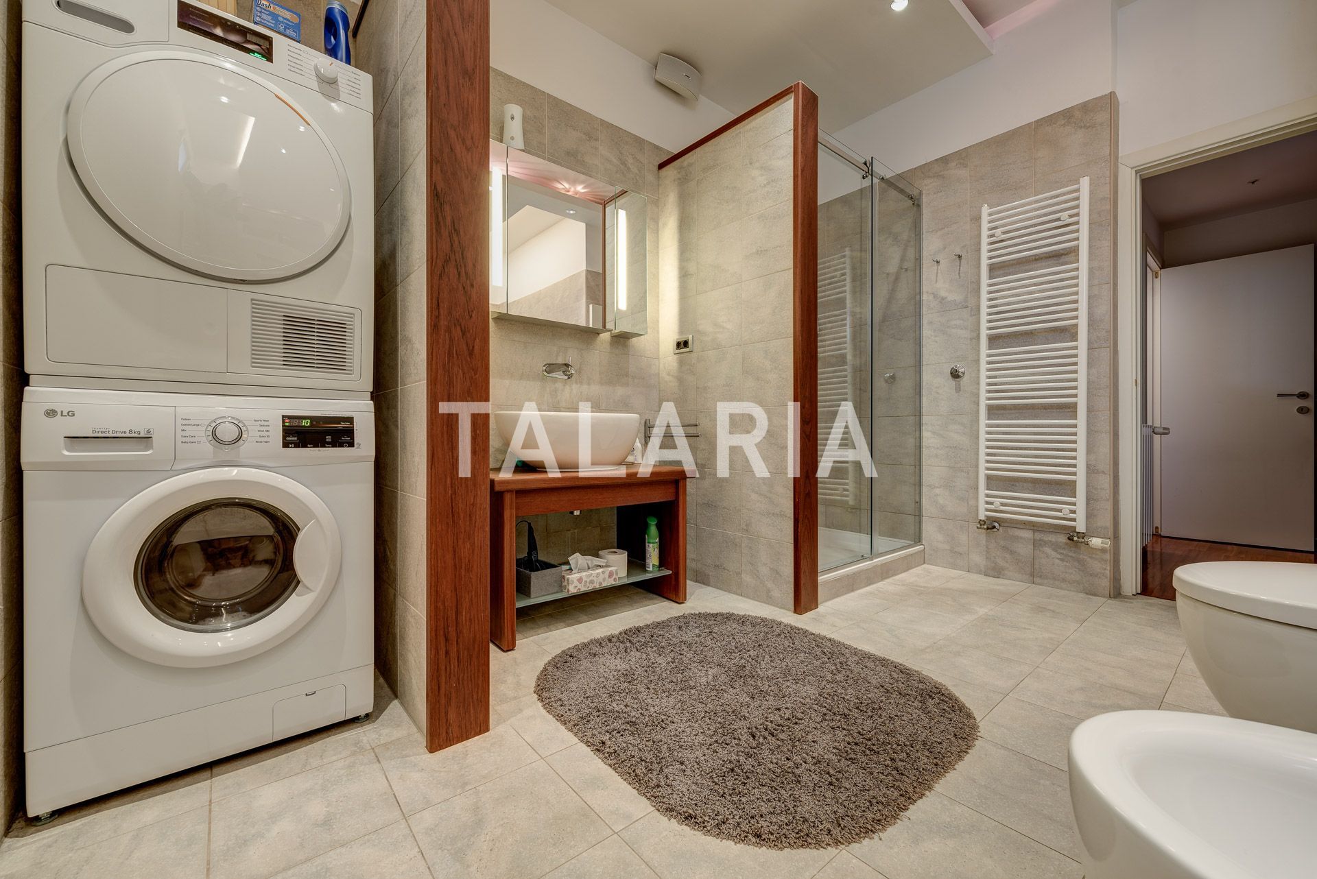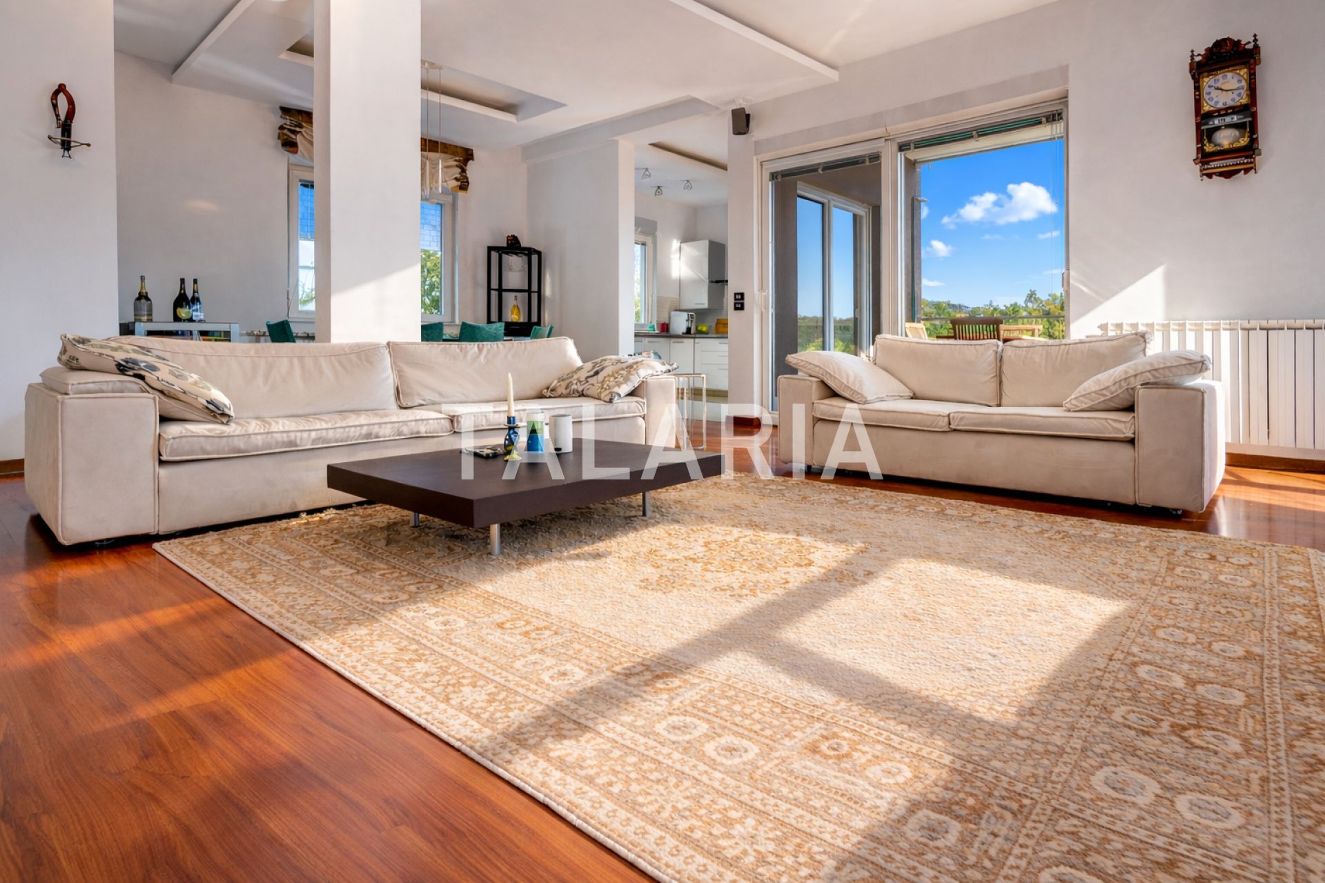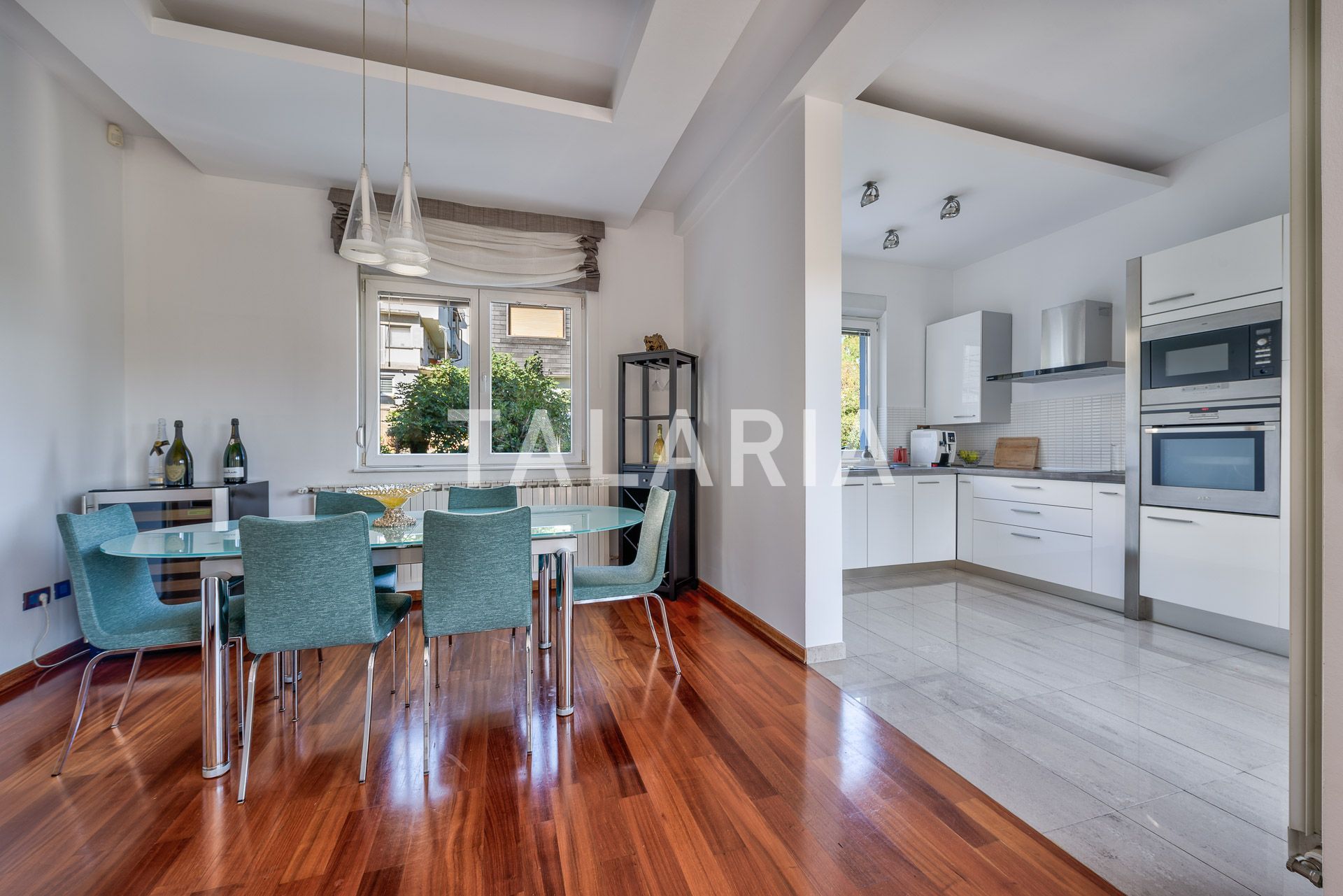Luksuzan 4-sobni stan okružen zelenilom, sastoji se od prostranog dnevnog boravka sa blagovaonom/kuhinjom i izlazom na terasu (10m2), 3 spavaće sobe, garderobe, kupaonice i gostinjskog WC-a. Opremljen visoko kvalitetnim materijalima, klimatiziran, alarmni sustav, električni podizači roleta, podno grijanje (kupaonica), video portafon, vinski hladnjak, jacuzzi kada, vrhunska HI-FI tehnika. Stan ima dvoetažnu garažu za 2 automobila.