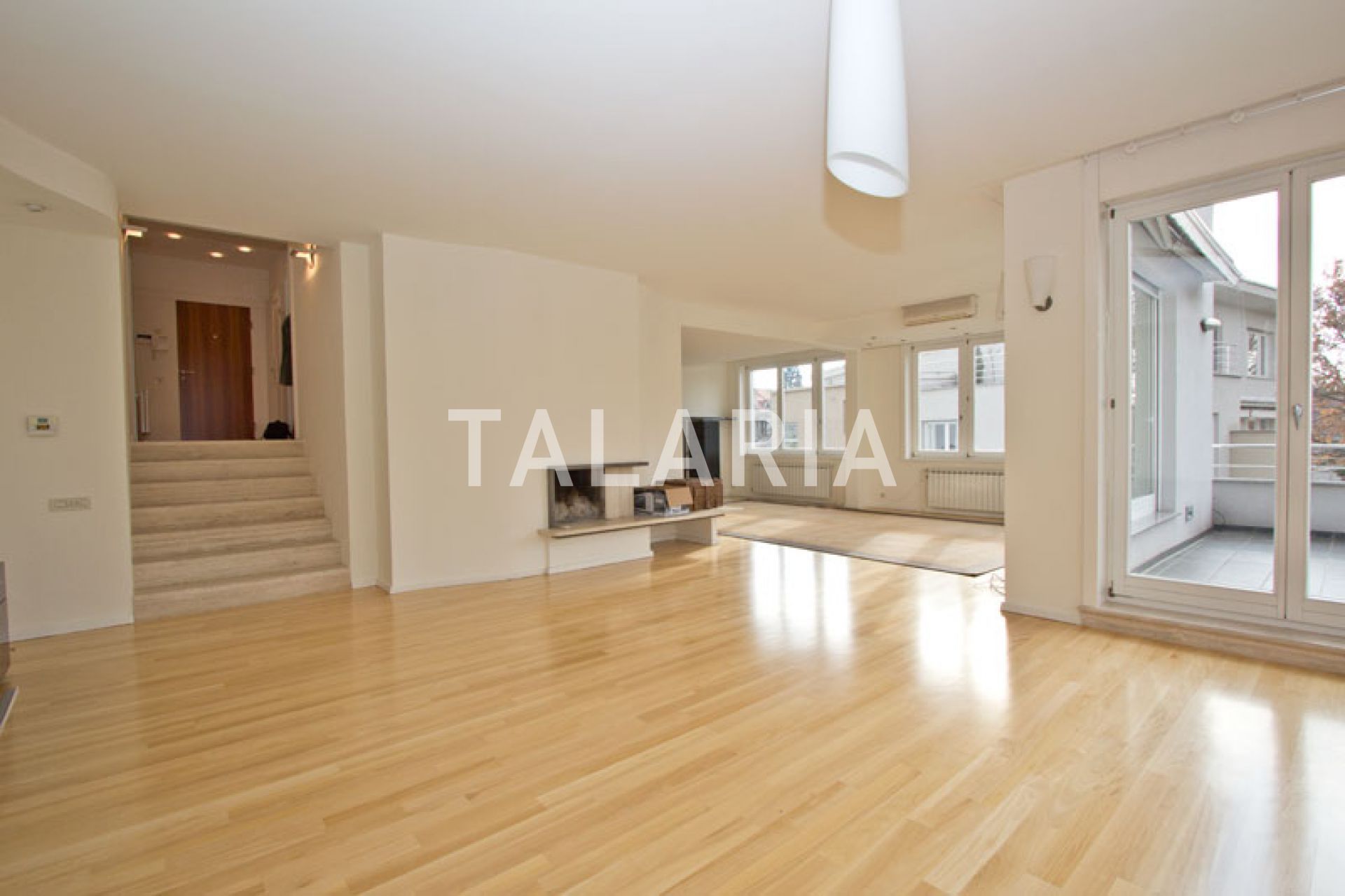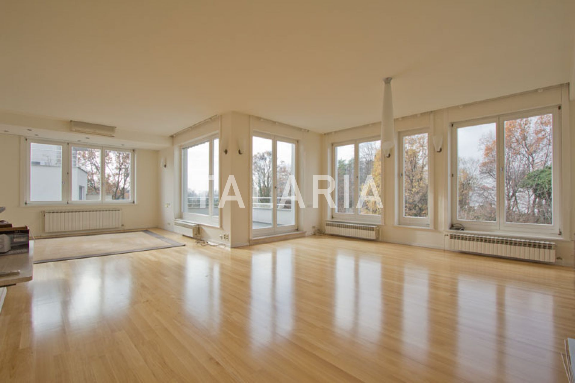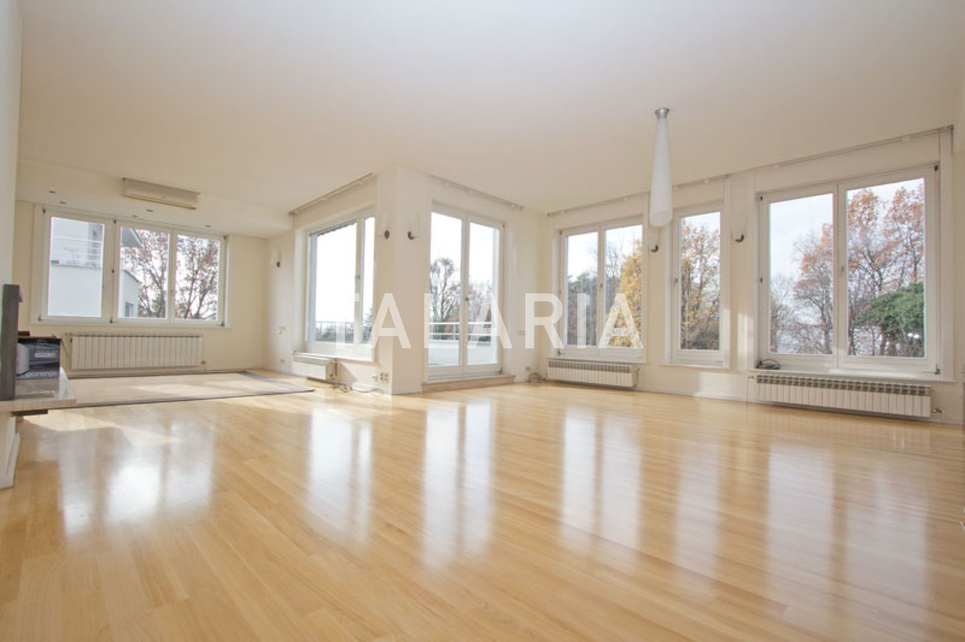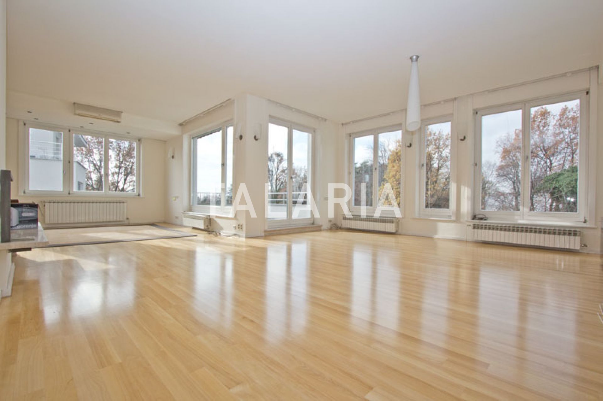 Genijalan stan u otmjenoj zgradi na otmjenoj adresi! Stan je tlocrtno razigran kroz 3 poluetaže a sastoji se od nivoa na kojem su ulazni hol, kuhinja, gostinjski WC, 2 spavaće sobe i kupaona, te dvije poluetaže od samo 5-10 stepenica visinske razlike. Na poluetaži iznad ulaza je velika roditeljska soba sa velikom garderobom i kupaonom te terasom; na poluetaži ispod ulaza je raskošan, ogroman dnevni boravak s kaminom te izlazom na terasu koja gleda na mirnu dvorišnu stranu prema šumi. Cijeli boravak je u velikim prozorima i stijenama koje se otvaraju prema zelenilu. Stanu pripada garaža i jedno parkirno mjesto. AGENCIJSKA PROVIZIJA JEDNA MJESEČNA NAJAMNINA +PDV.