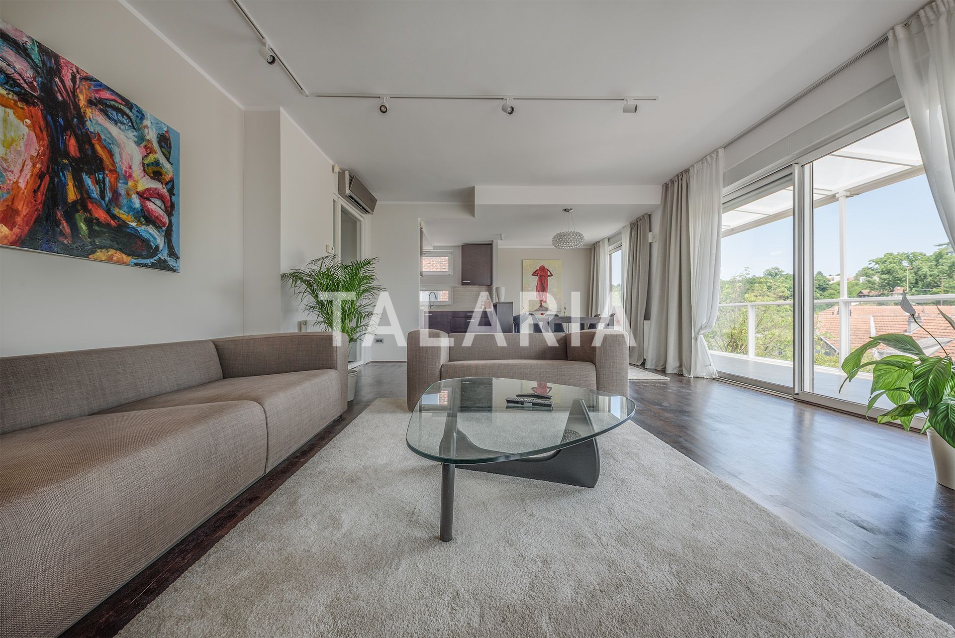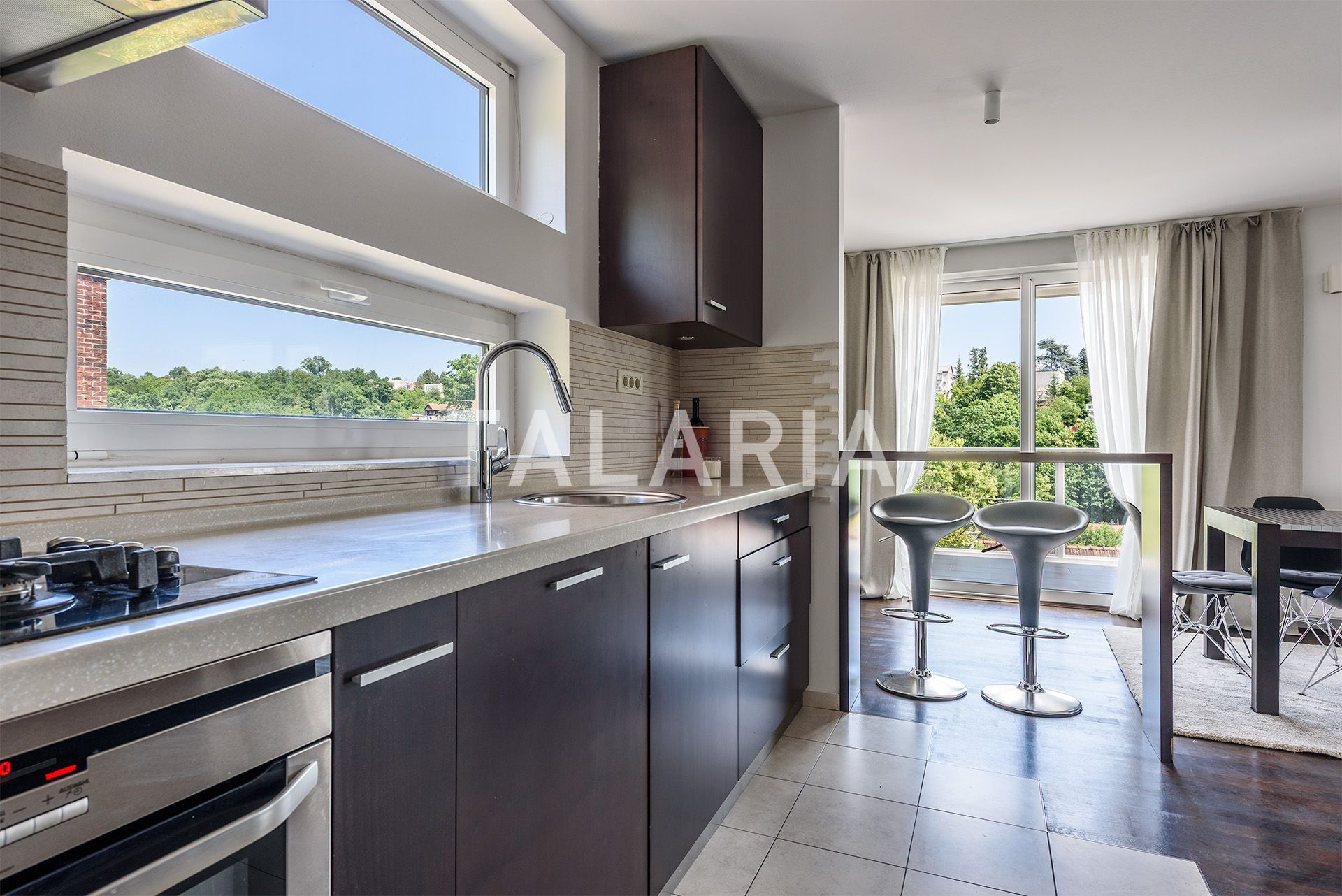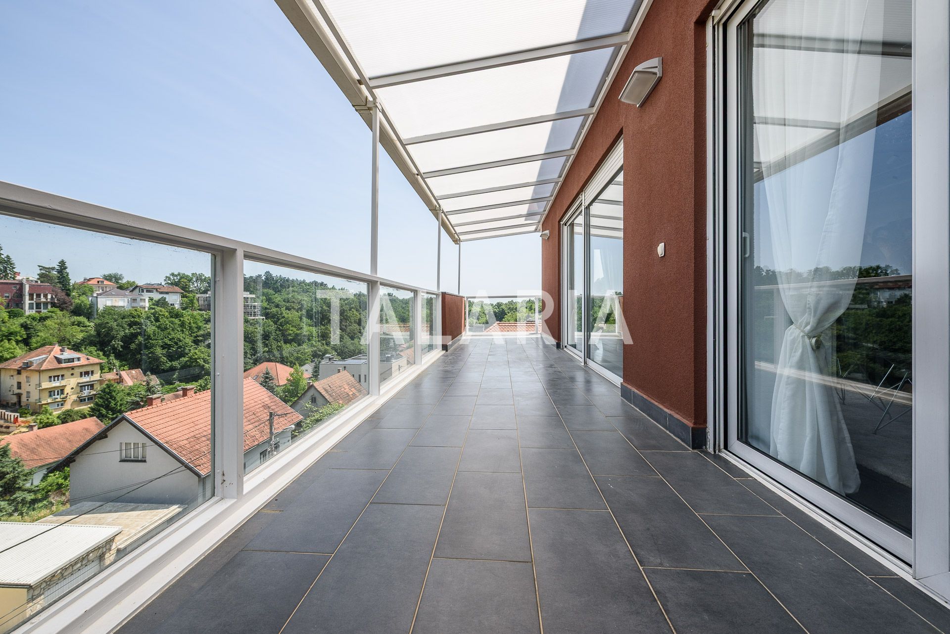A beautiful penthouse in a small urban villa, spanning the entire floor and open to all four sides. The floor plan is excellently organized. The entrance in the middle of the apartment leads us to a hallway with a wardrobe and a guest toilet, from which on the left we go to the intimate part of the apartment with 3 bedrooms and a bathroom (bathtub). Two rooms share a beautiful covered terrace. The right side of the hallway opens onto a beautiful living room connected to the dining room and kitchen. This open plan space is surrounded by glass walls that continue onto a beautiful covered terrace oriented to the east and south, with a magical open view of the forest. The apartment has a double garage and a storage room in the basement. Excellent apartment and building. Quality construction, aluminum windows and joinery, quiet street. Agency recommendation.
