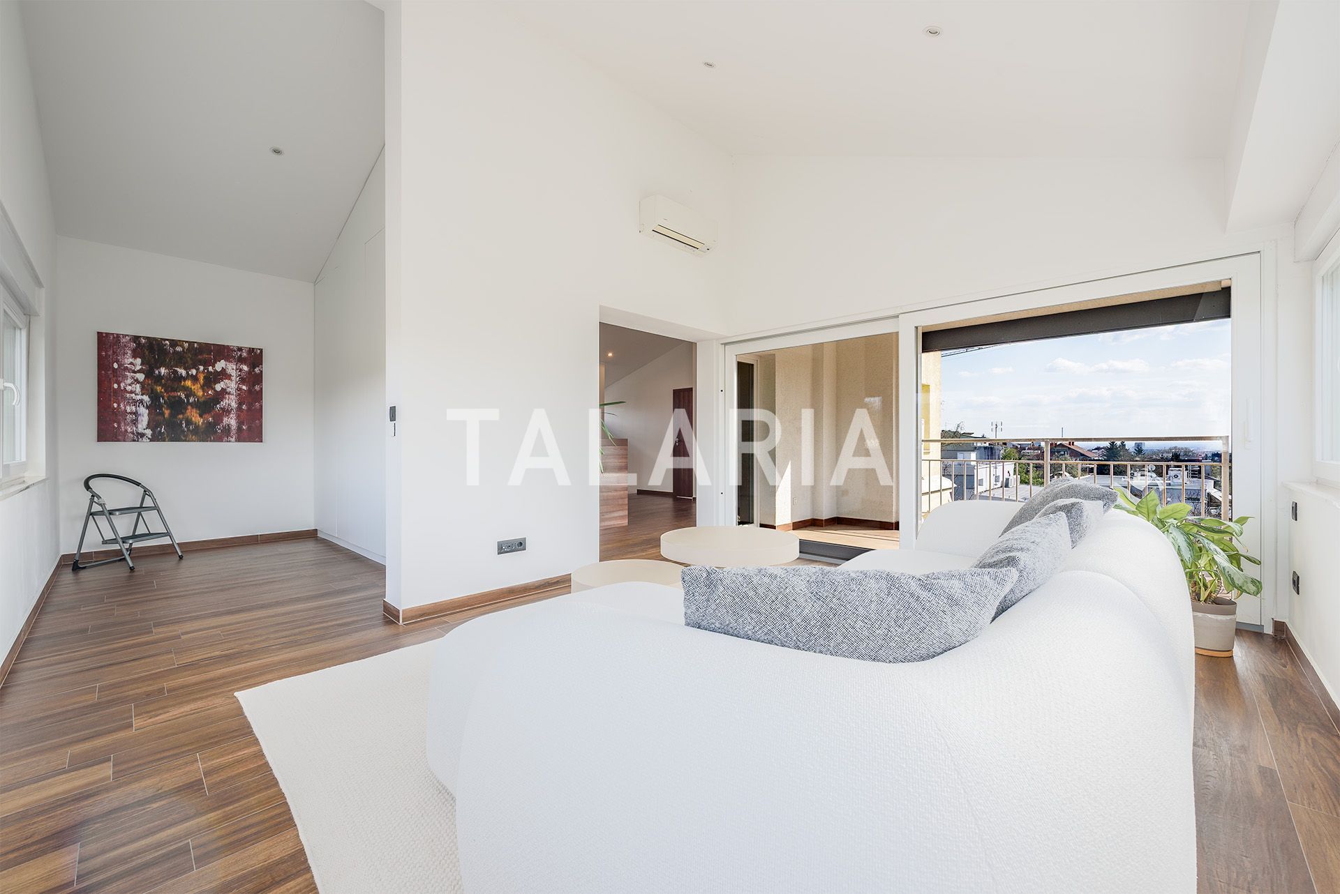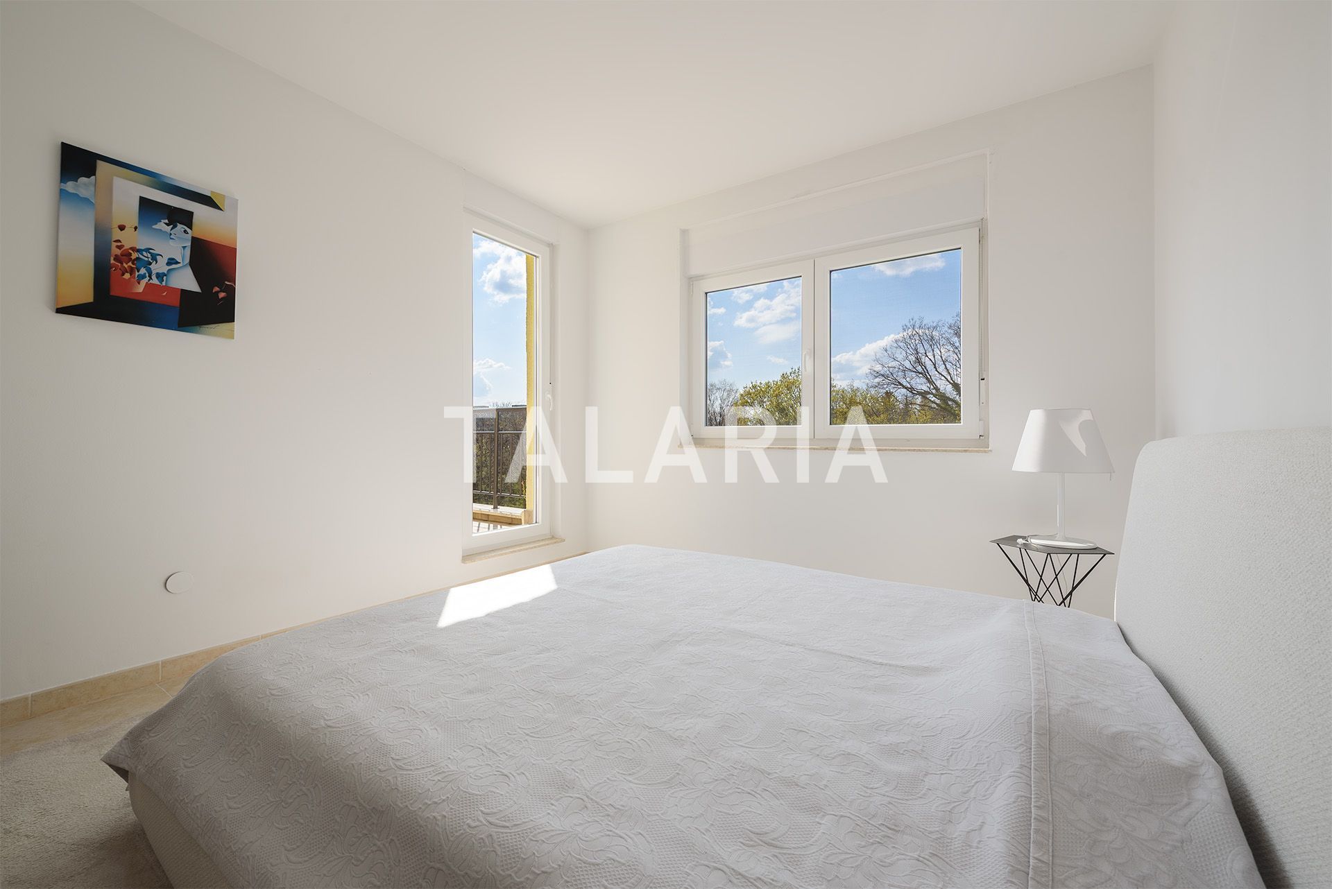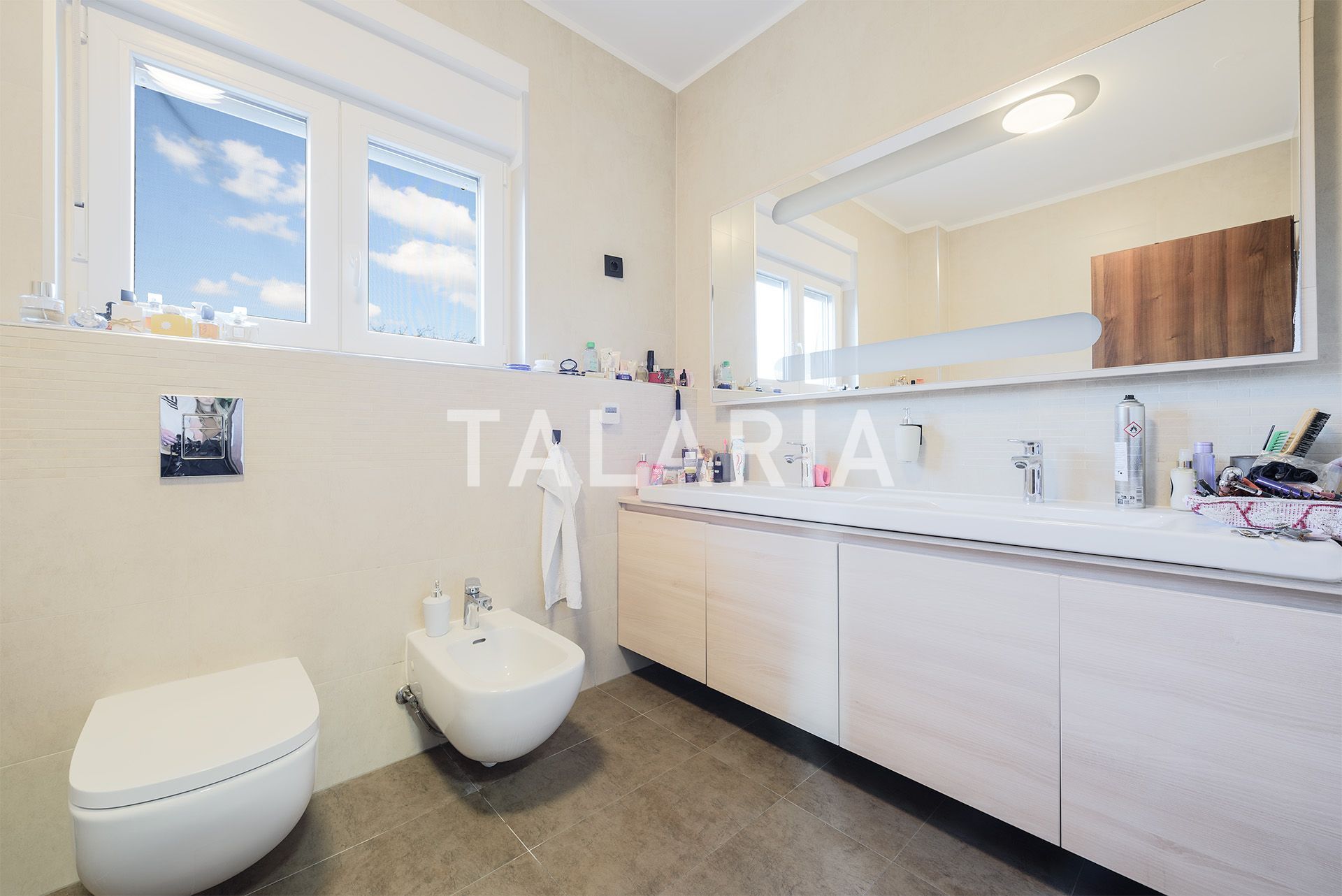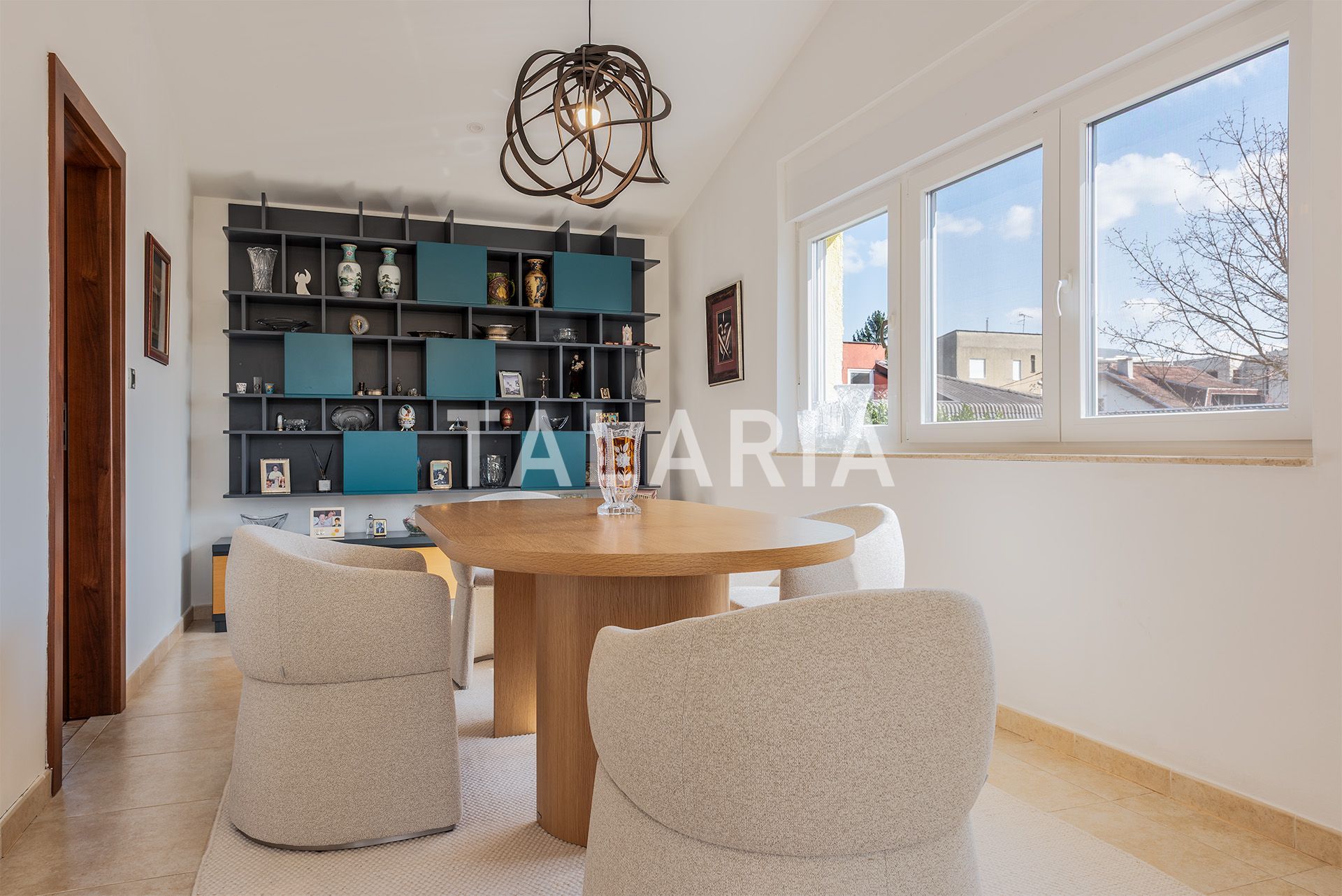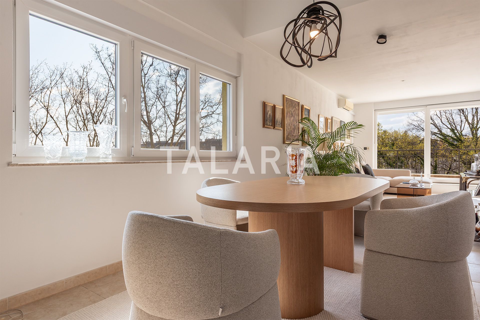 A fully furnished two-level apartment of 240 m² located on the 2nd floor of a building constructed in 1997. The first level features a spacious living room with access to a large terrace, a dining area, a separate kitchen, 2 bedrooms, 2 bathrooms, and a smaller study or walk-in closet. Stairs lead to the 2nd level, which consists of a living room with access to a balcony, a bedroom with a walk-in wardrobe, and a bathroom. The apartment is oriented to all 4 sides of the world making it very bright and offering a beautiful view of greenery. It comes with one garage space and one outdoor parking space.It is situated in an excellent location in Srebrnjak, close to all essential amenities.