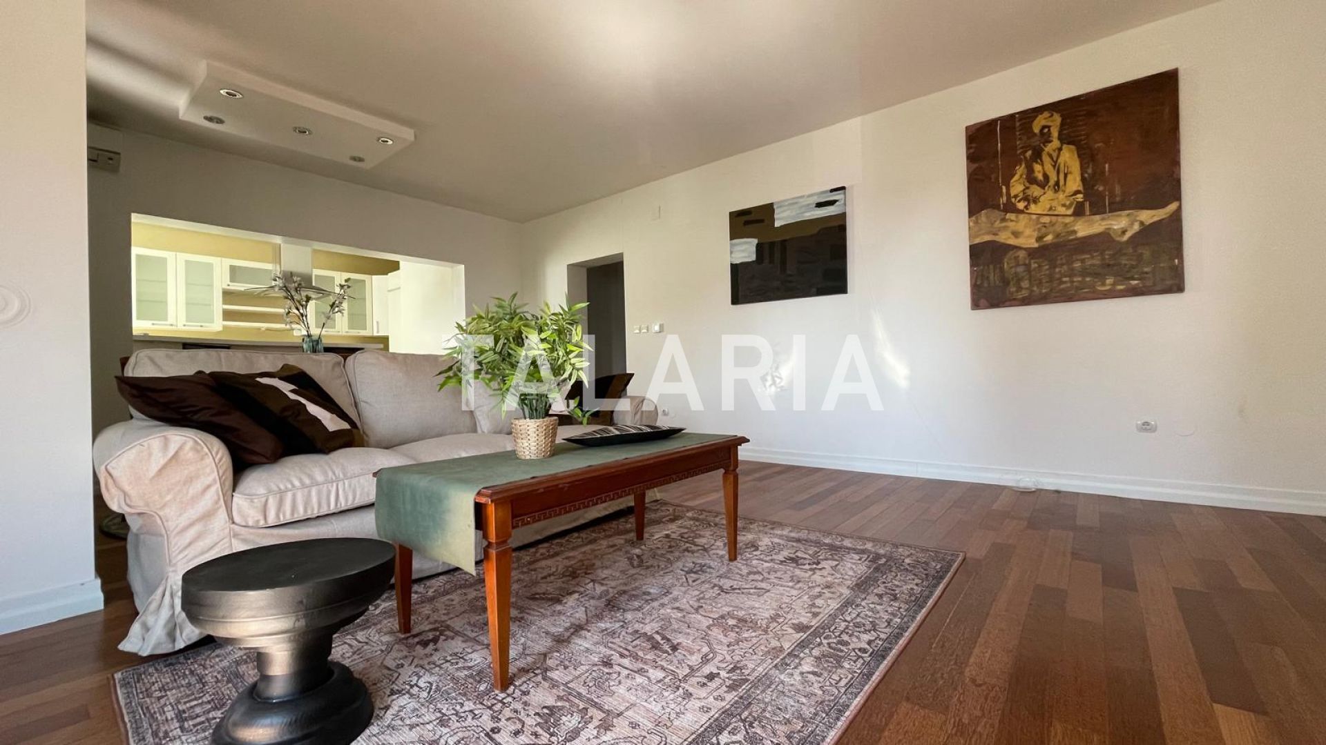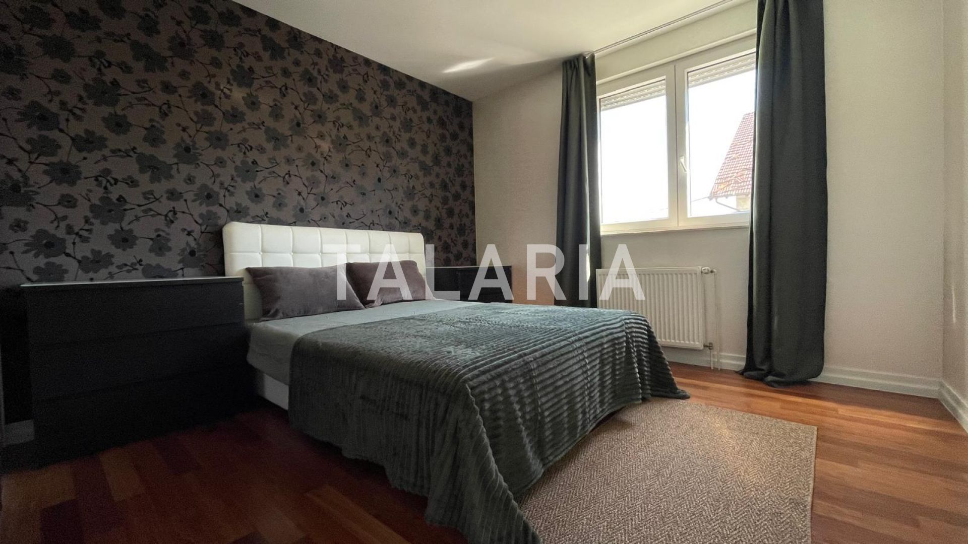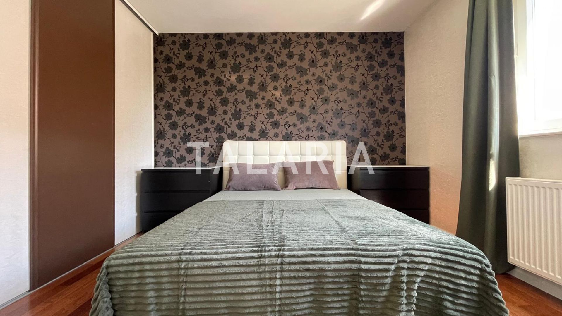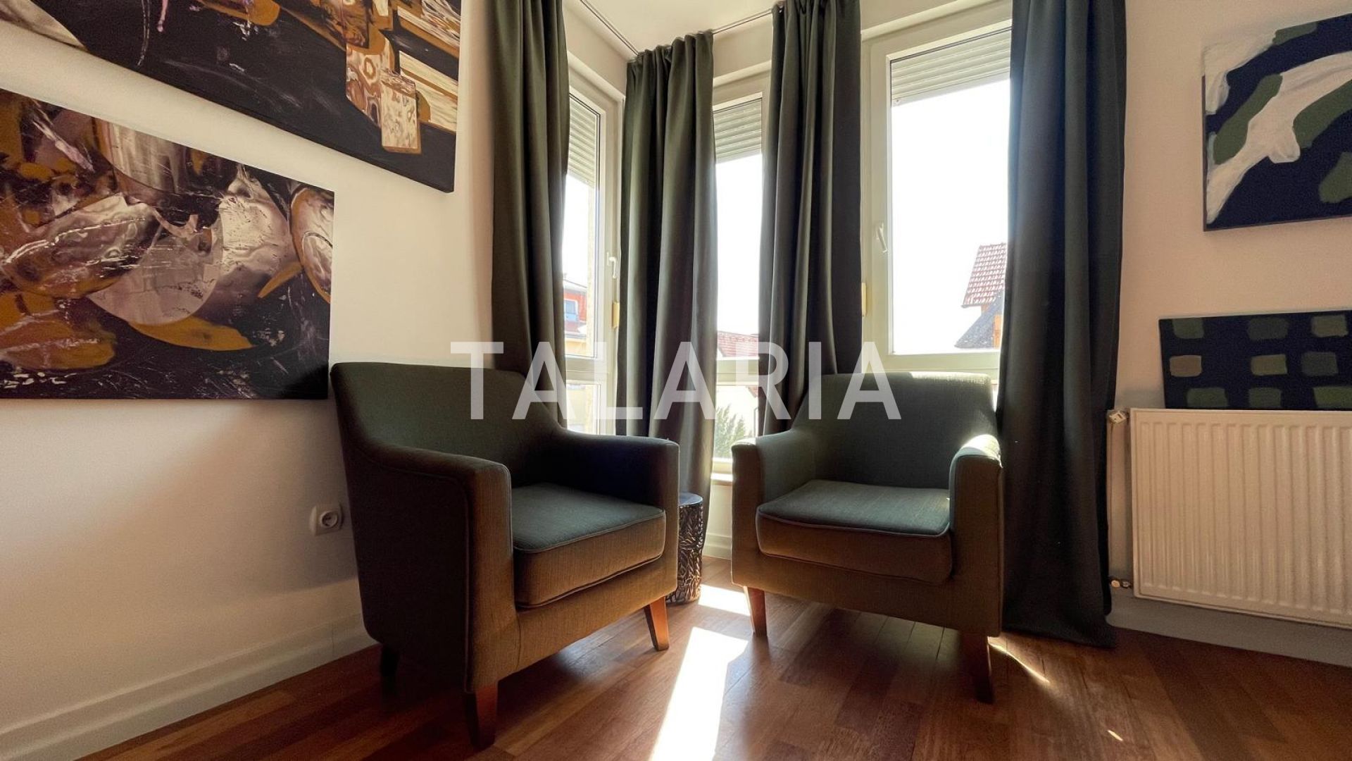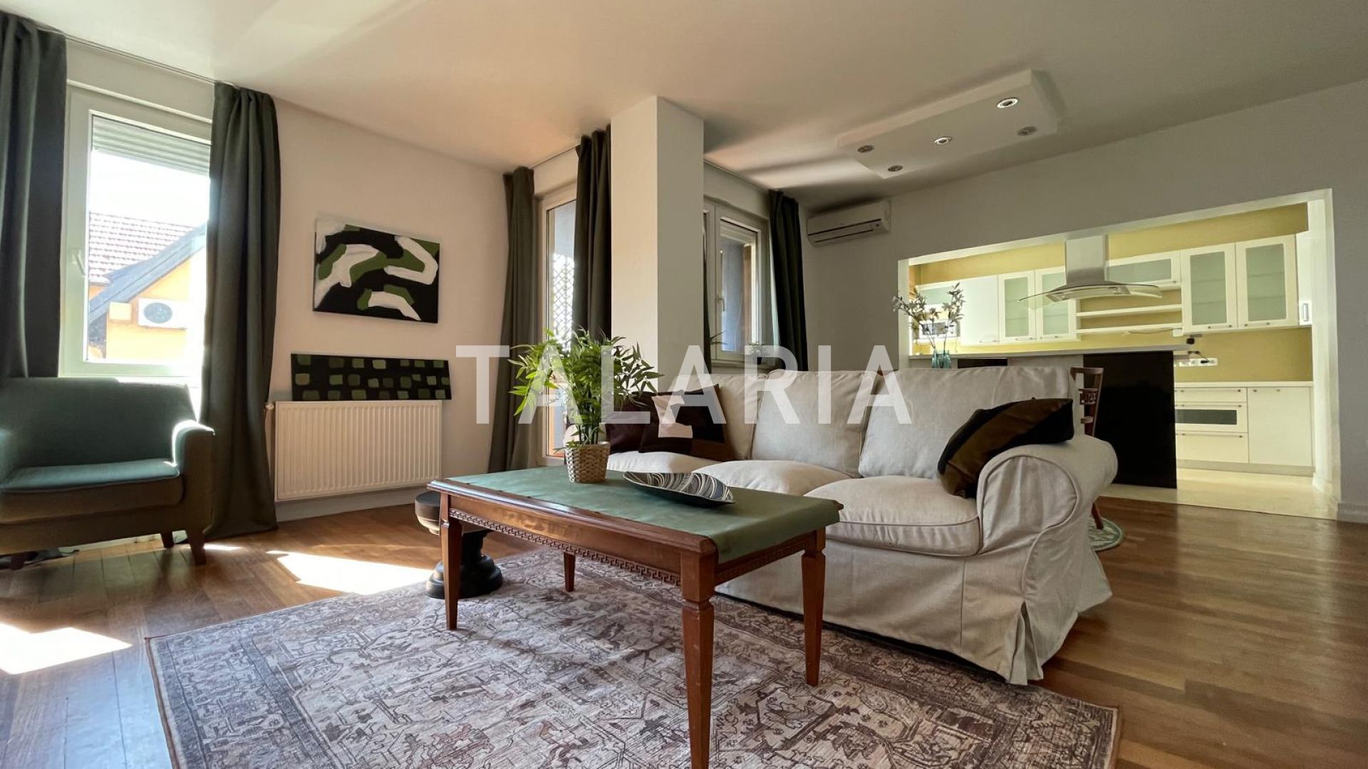 Beautiful 100m2 apartment located on the 1st floor of an urban villa surrounded by greenery, quiet street tucked away from the main road. It consists of an entrance hall, living room, kitchen (built-in Italian kitchen with complete equipment), bathroom, guest toilet, 2 bedrooms, wardrobe and loggia. View of the greenery, East-West orientation
