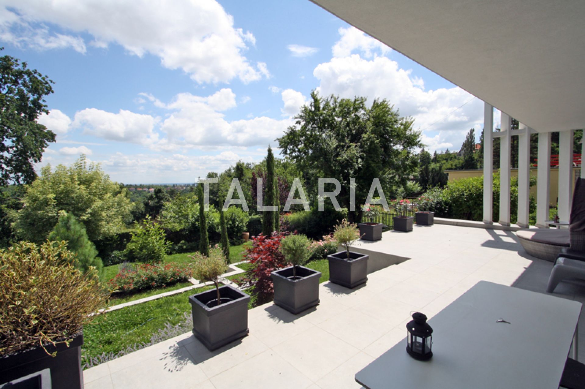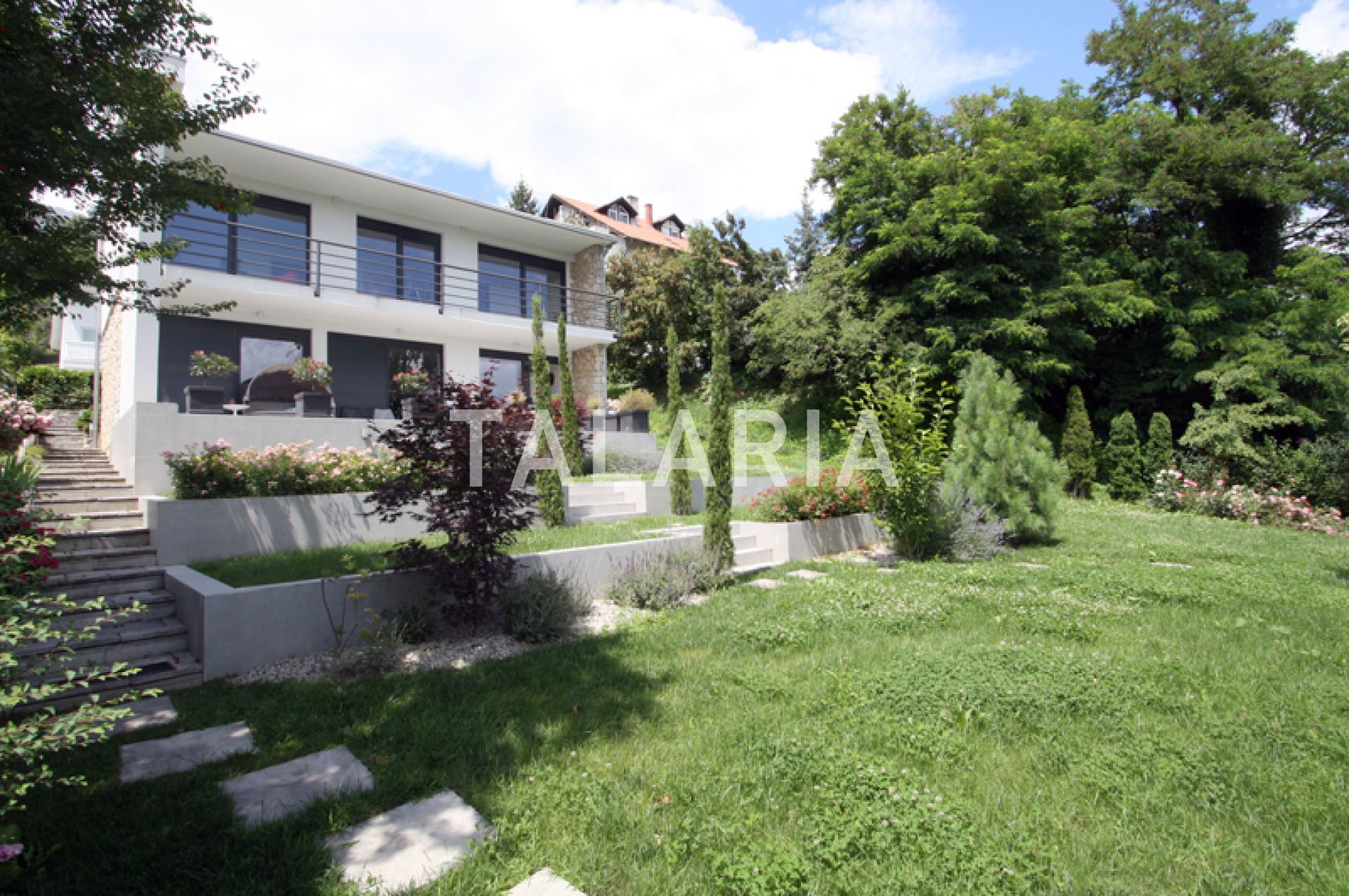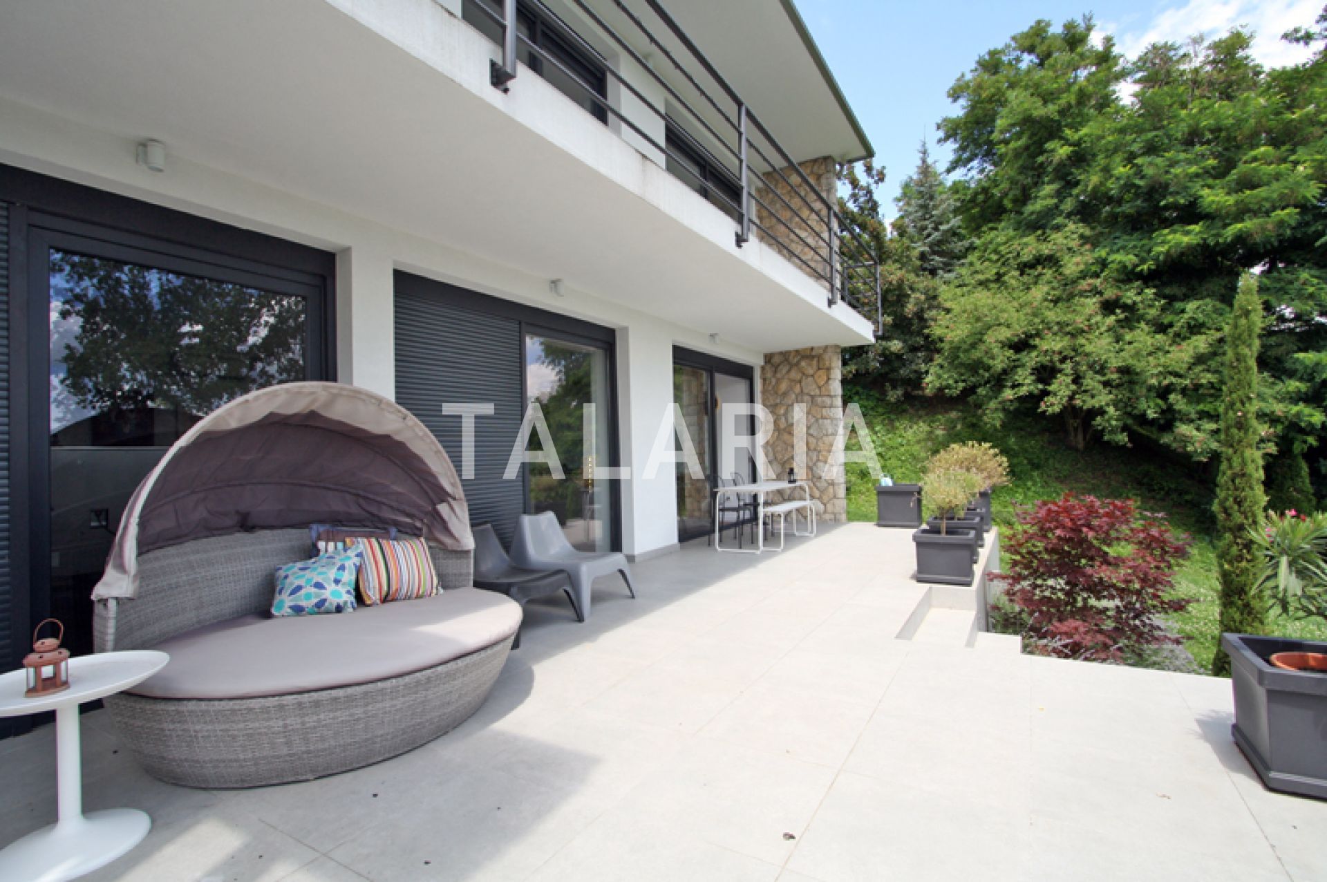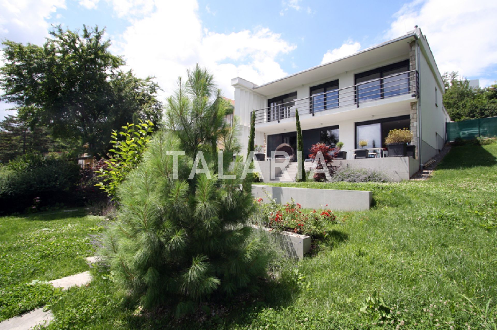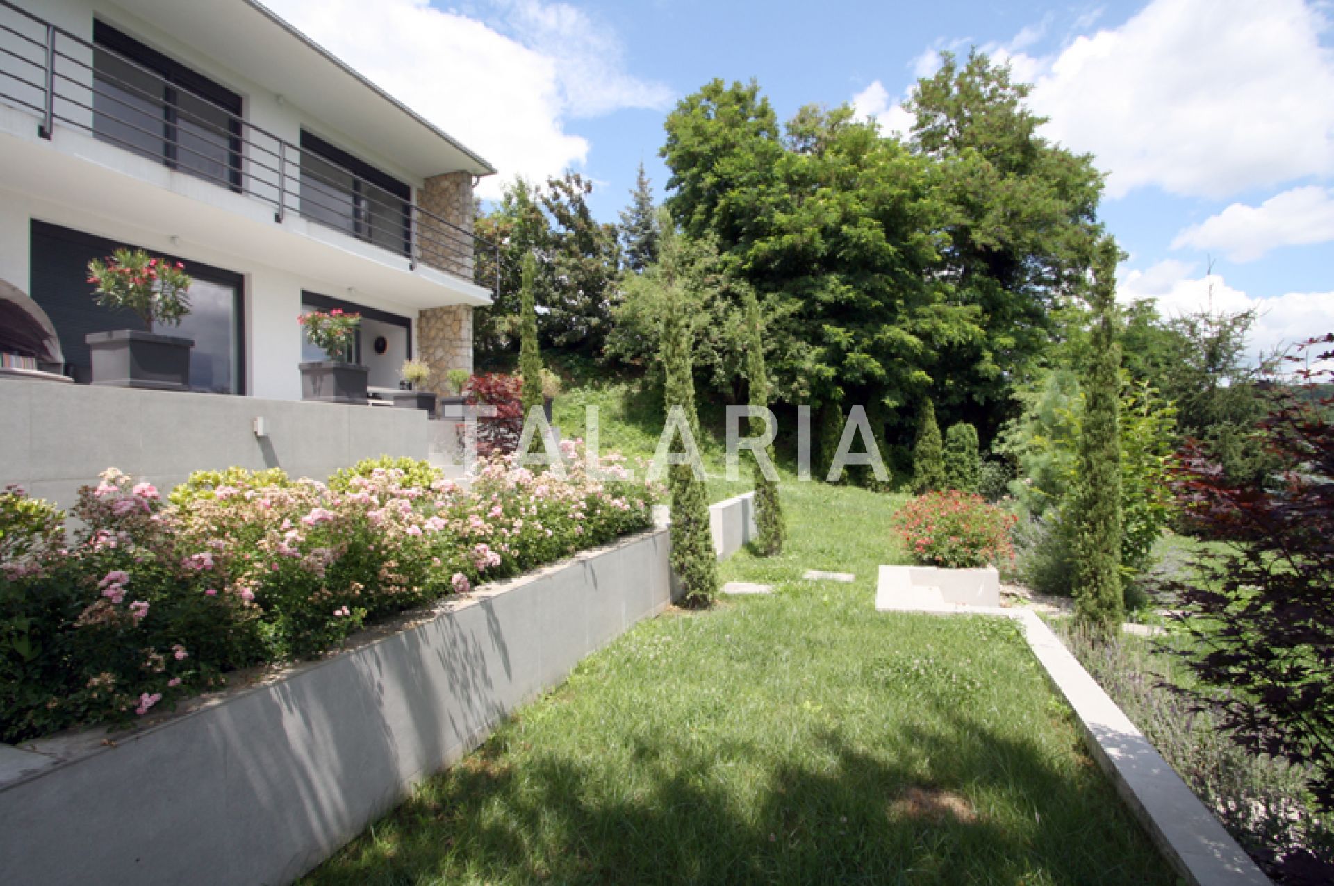 A modern, luxuriously furnished small villa with a beautiful garden is located in a quiet street just 10 minutes from the city and the bustle. The magical, small but rich garden gives it an extra dimension and a relaxing atmosphere. Beautiful family-friendly house, spread over 2 floors. The ground floor consists of entrance hall, magical open space living room with dining area and kitchen, spacious terrace with access to a beautiful garden, guest toilet, gym with jacuzzi and Finnish sauna and laundry room with storage. Upstairs are 3 bedrooms, 2 bathrooms, large covered balcony. Open view. Quiet street. The house has outdoor parking and a large garage with direct entrance to the house. It is rented unfurnished, for a longer period of time.