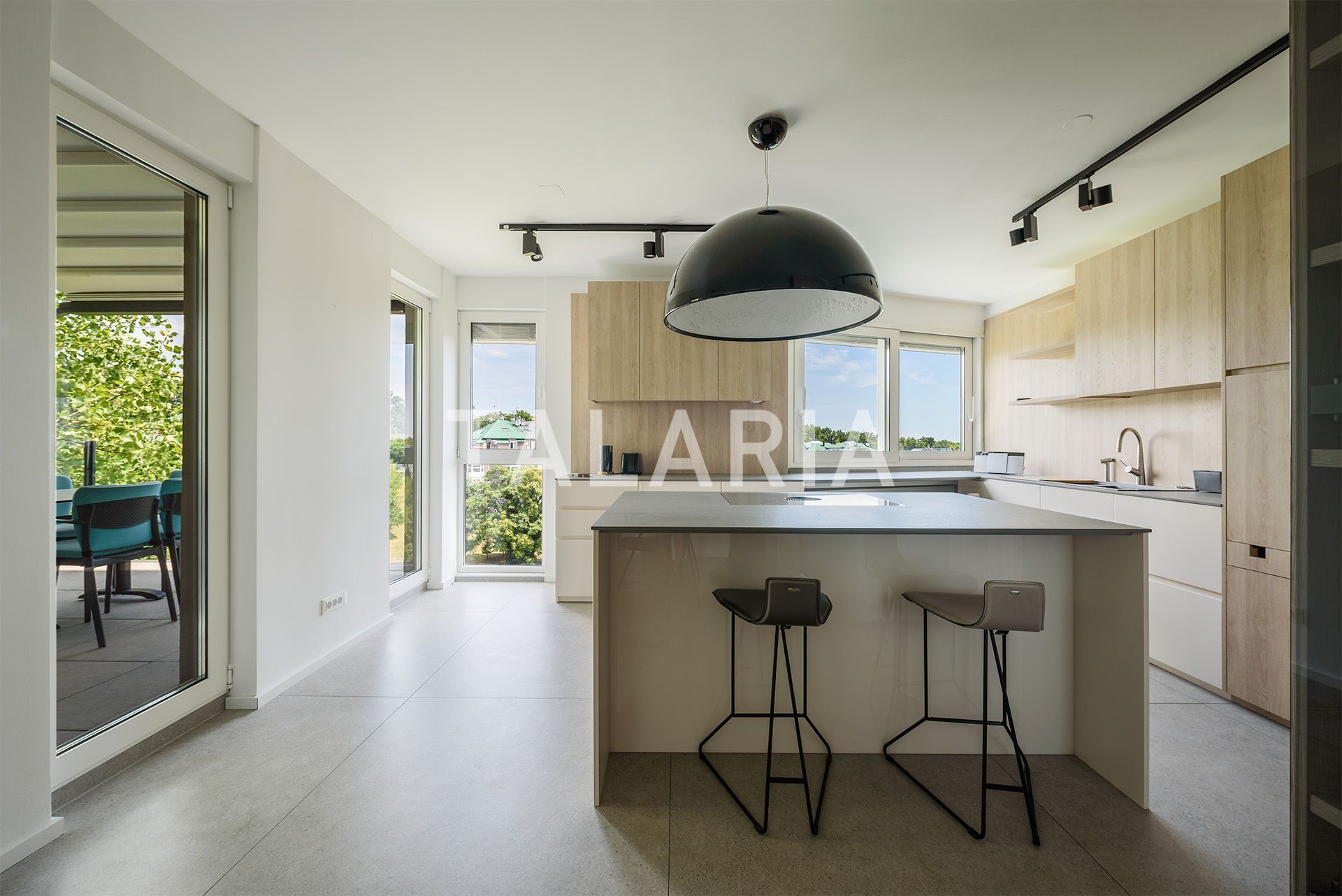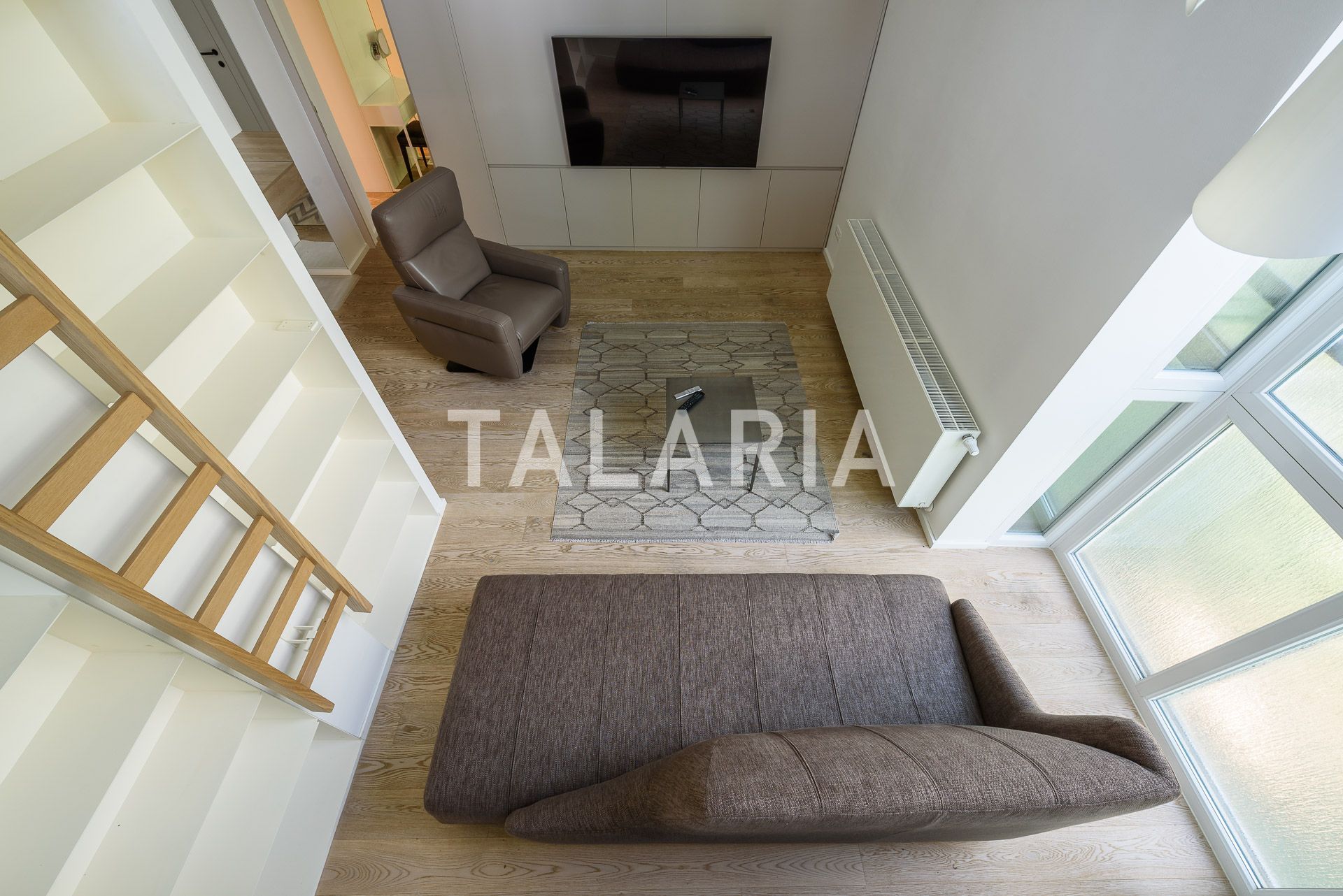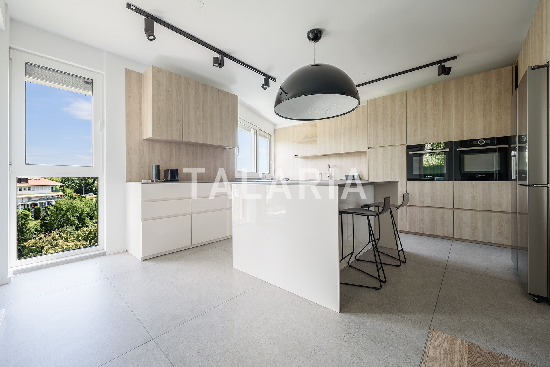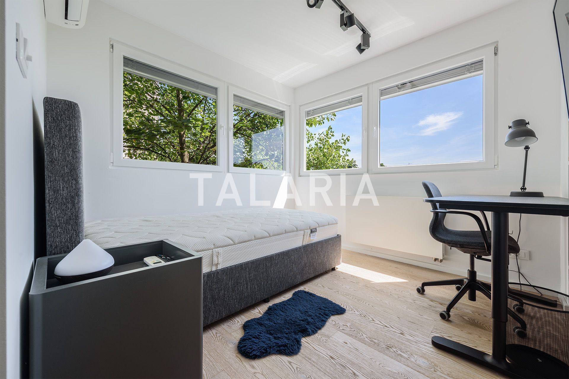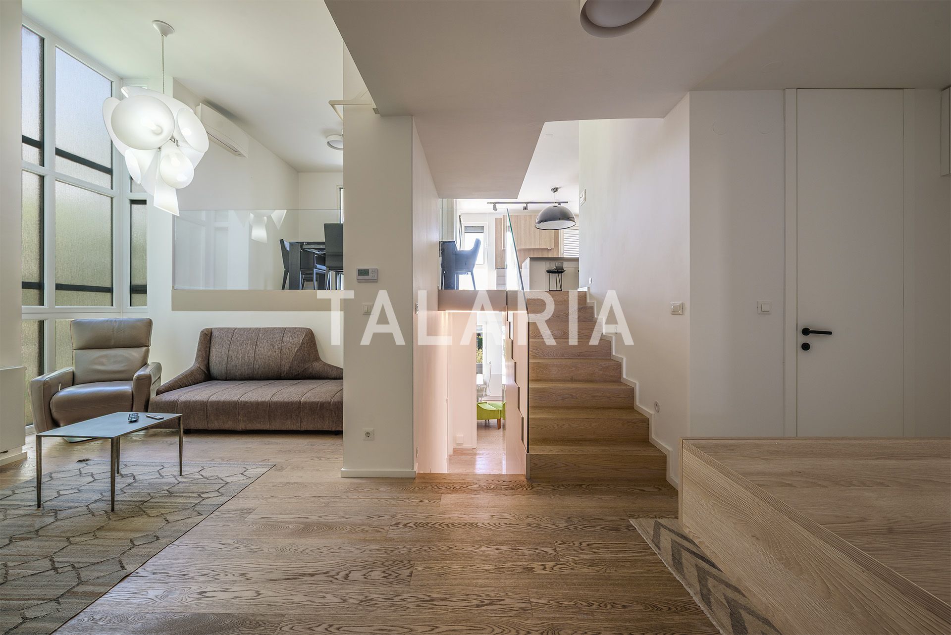 Predivan obiteljski, moderno adaptiran stan razigran po poluetažama nudi komforno stanovanje za četveročlanu obitelj. Na glavnoj etaži uz ulaz u stan nalazi se gostinjski toalet, roditeljska soba sa garderobom i kupaonom , te dnevni boravak. Iz boravka se stepenicama penjemo ka luksuzno opremljenoj kuhinji sa velikom blagovaonom koja se nastavlja na natkrivenu terasu s pogledom na zelenilo. Iz boravka stepenicama dole, dolazimo do 2 dječje sobe svaka sa svojom kupaonom i garderobom. Stanu pripada jedno parkirno mjesto pred zgradom. Vrlo šarmantan! Preporuka agencije!