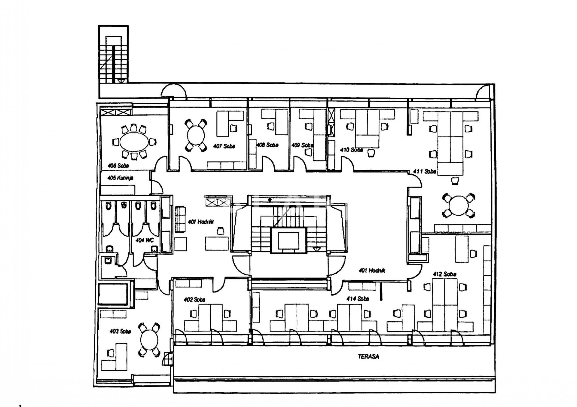 Sastoji se od ulaznog prostora, 10 uredskih prostorija, 2 sanitarna čvora, kuhinje s blagovaonicom te terase. Obzirom da se prostor prostire preko pune etaže ima izuzetno puno prozora orijentiranih ka istoku i zapadu. Upravo zbog puno staklenih stijena od zida do zida, prostor je izuzetno tlocrtno prilagodljiv potrebama budućeg zakupnika, a svi zidovi u prostoru su pregradni pa se može lako dobiti i open space koncept poslovanja. Sva ulaganja isključivi su trošak budućeg zakupca.