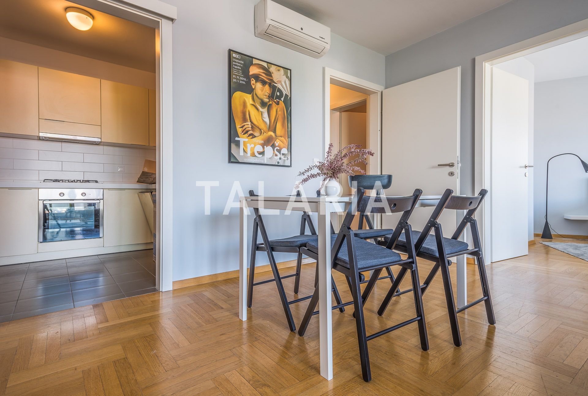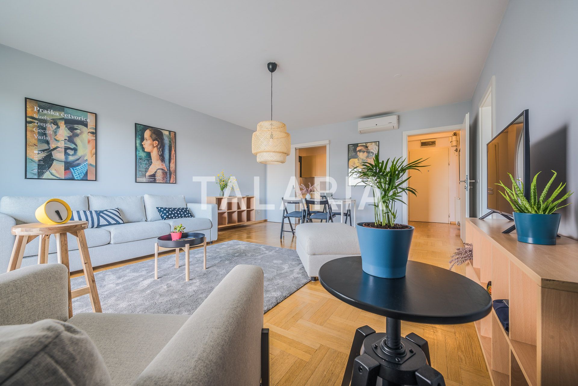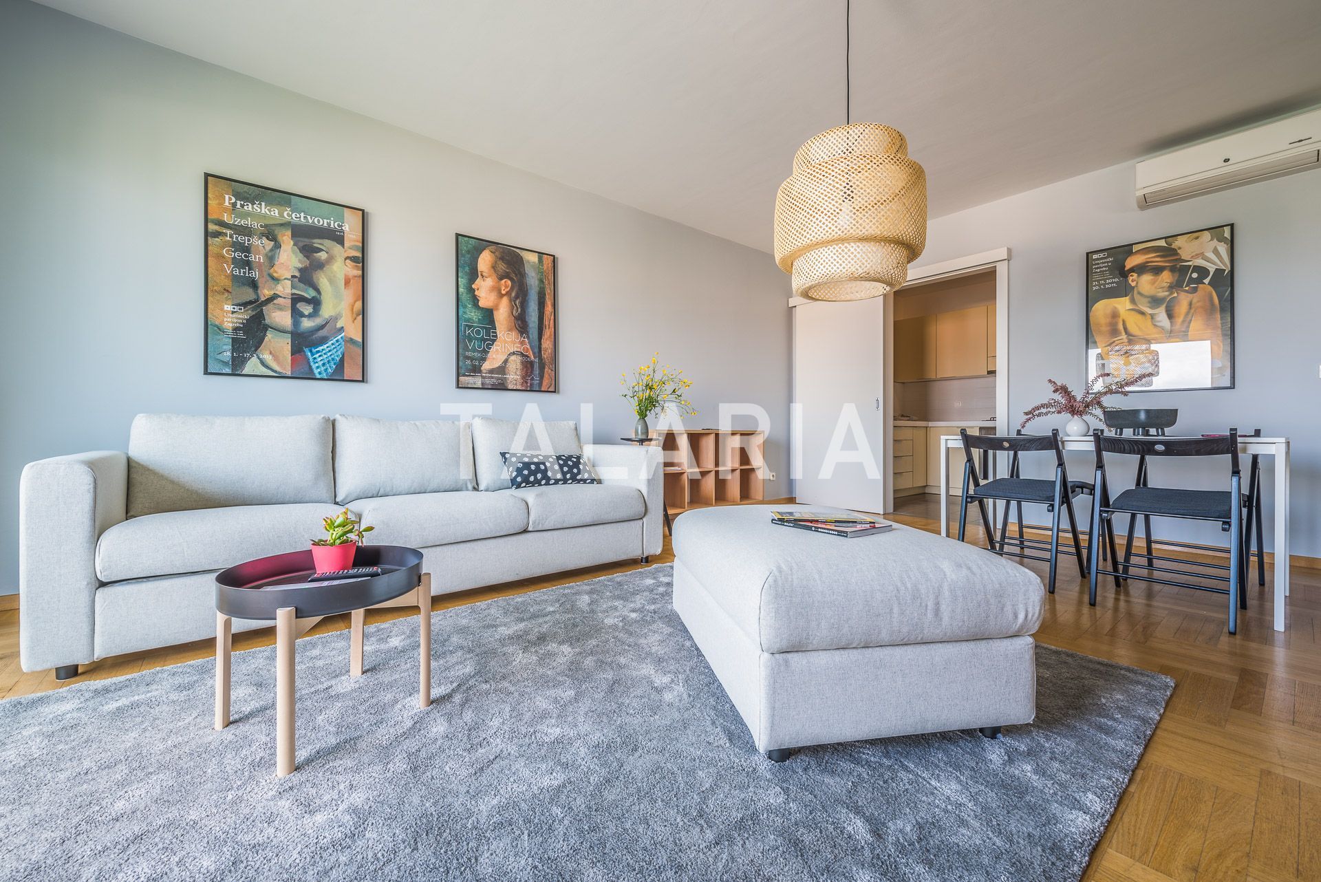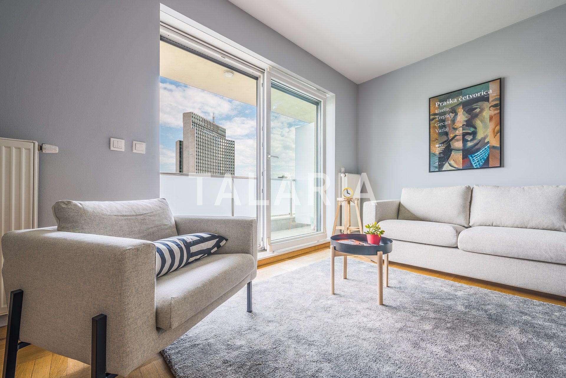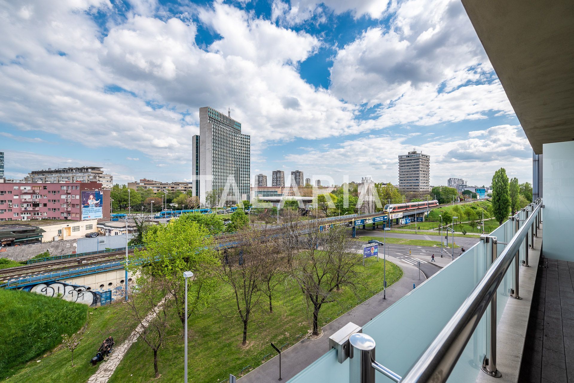 Odličan dvosoban stan tlocrtne površine 75,61 m2 (NKP 68,18 m2) s urbanim pogledom na neboder Zagrepčanke. Stan se sastoji od ulaznog hola s ugradbenim ormarima, prostrane spavaće sobe s izlazom na terasu, velikog i svijetlog dnevnog boravka s blagovaonom, odvojene odlično opremljene kuhinje te kupaone s kadom. Moderno je namješten, potpuno novim namještajem. Pripada mu garažno parkirno mjesto u zgradi od 12,57 m2 (NKP 9,43 m2) te spremište 4,42 m2 (NKP 2,21 m2). Stan je zajedno s garažnim parkirnim mjestom i spremištem ukupne tlocrtne površine 92,60 m2 (ukupne neto korisne površine 79,82 m2). Moderna i kvalitetna zgrada. Super lokacija, blizu centra grada. Preporuka agencije!!