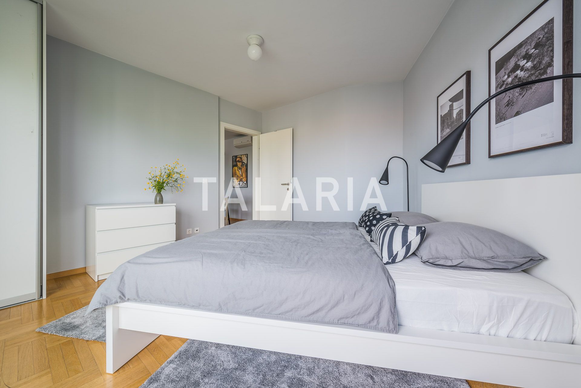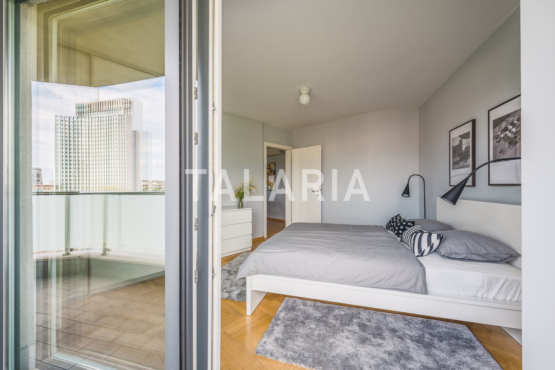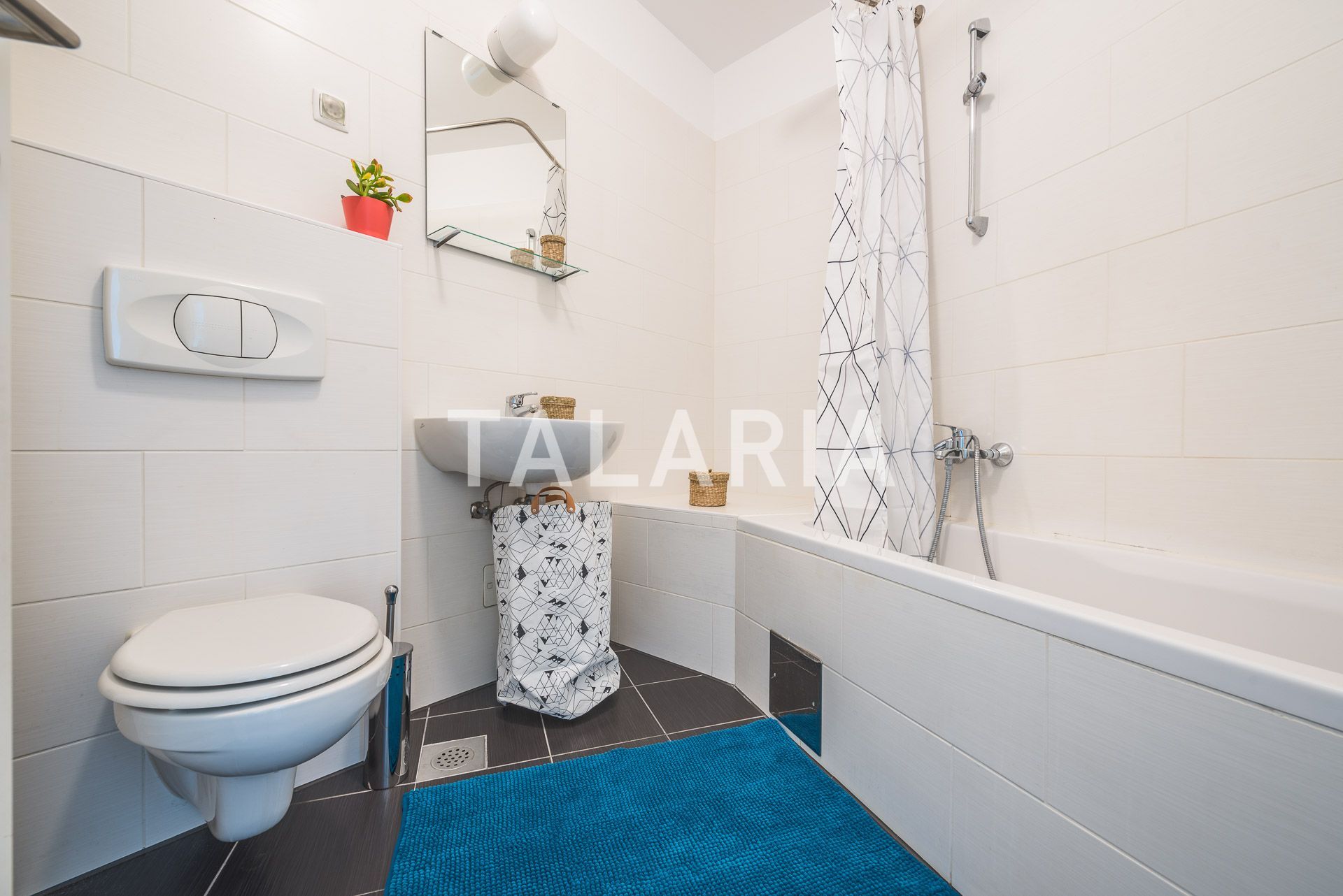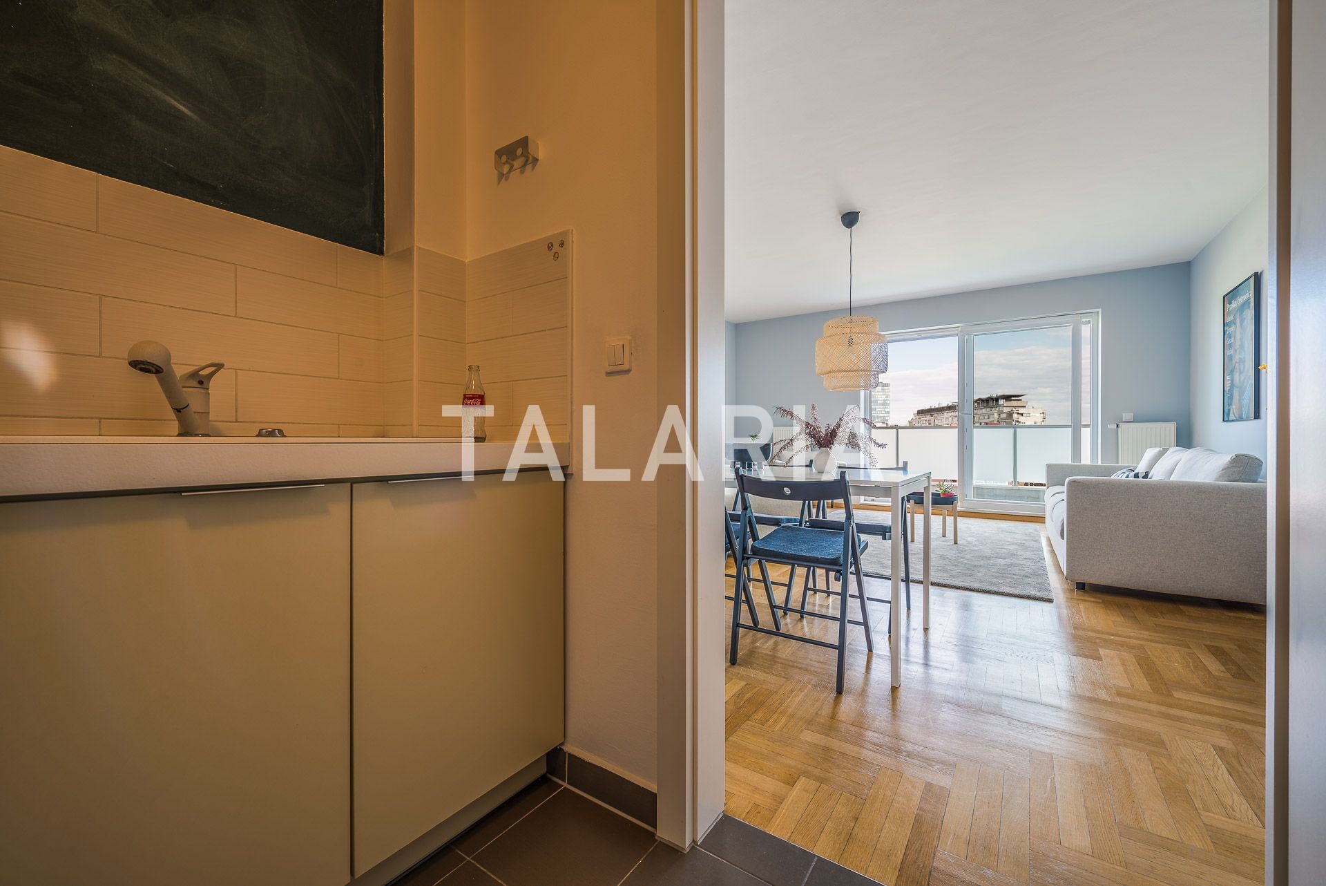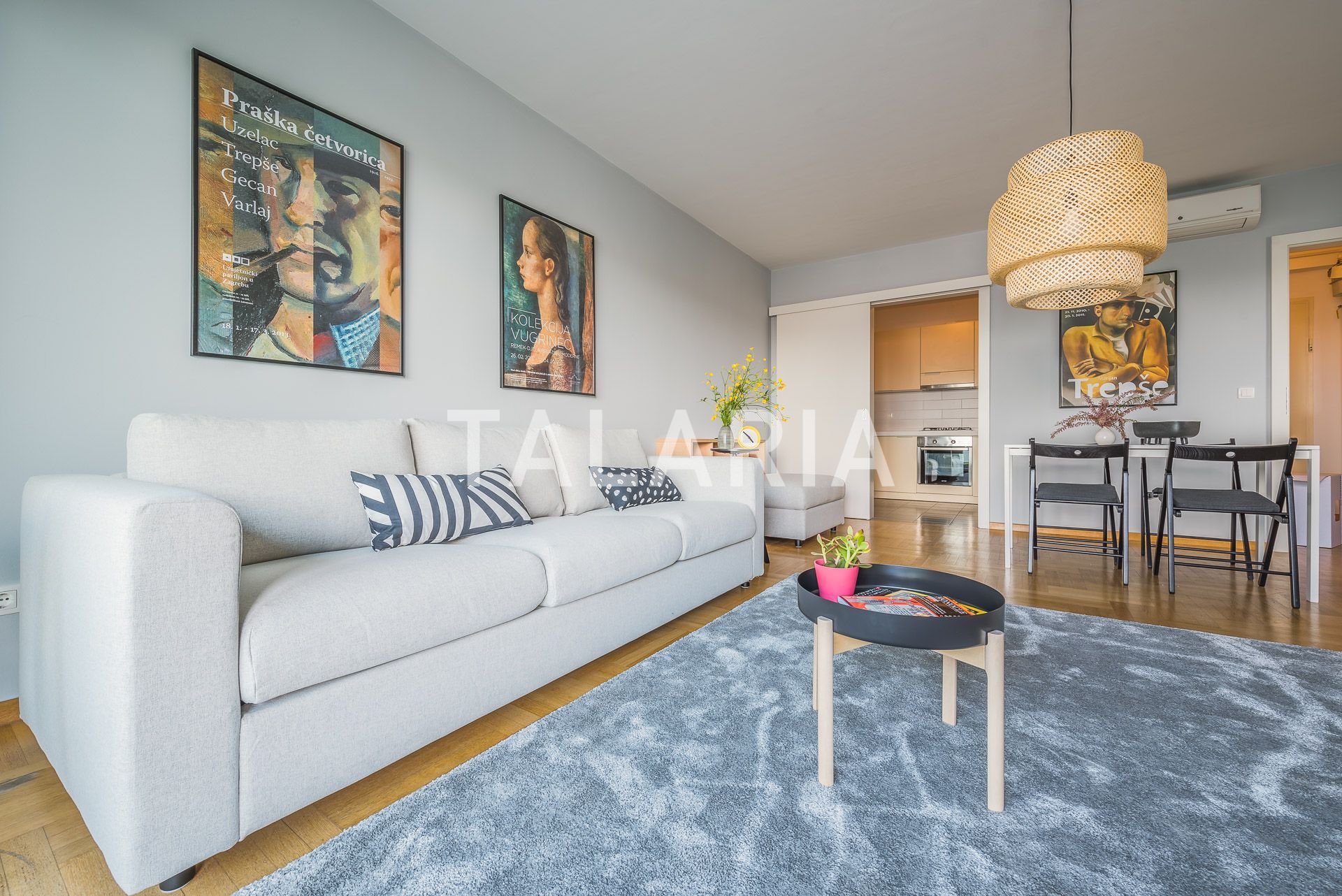 Odličan dvosoban stan tlocrtne površine 75,61 m2 (NKP 68,18 m2) s urbanim pogledom na neboder Zagrepčanke. Stan se sastoji od ulaznog hola s ugradbenim ormarima, prostrane spavaće sobe s izlazom na terasu, velikog i svijetlog dnevnog boravka s blagovaonom, odvojene odlično opremljene kuhinje te kupaone s kadom. Moderno je namješten, potpuno novim namještajem. Pripada mu garažno parkirno mjesto u zgradi od 12,57 m2 (NKP 9,43 m2) te spremište 4,42 m2 (NKP 2,21 m2). Stan je zajedno s garažnim parkirnim mjestom i spremištem ukupne tlocrtne površine 92,60 m2 (ukupne neto korisne površine 79,82 m2). Moderna i kvalitetna zgrada. Super lokacija, blizu centra grada. Preporuka agencije!!