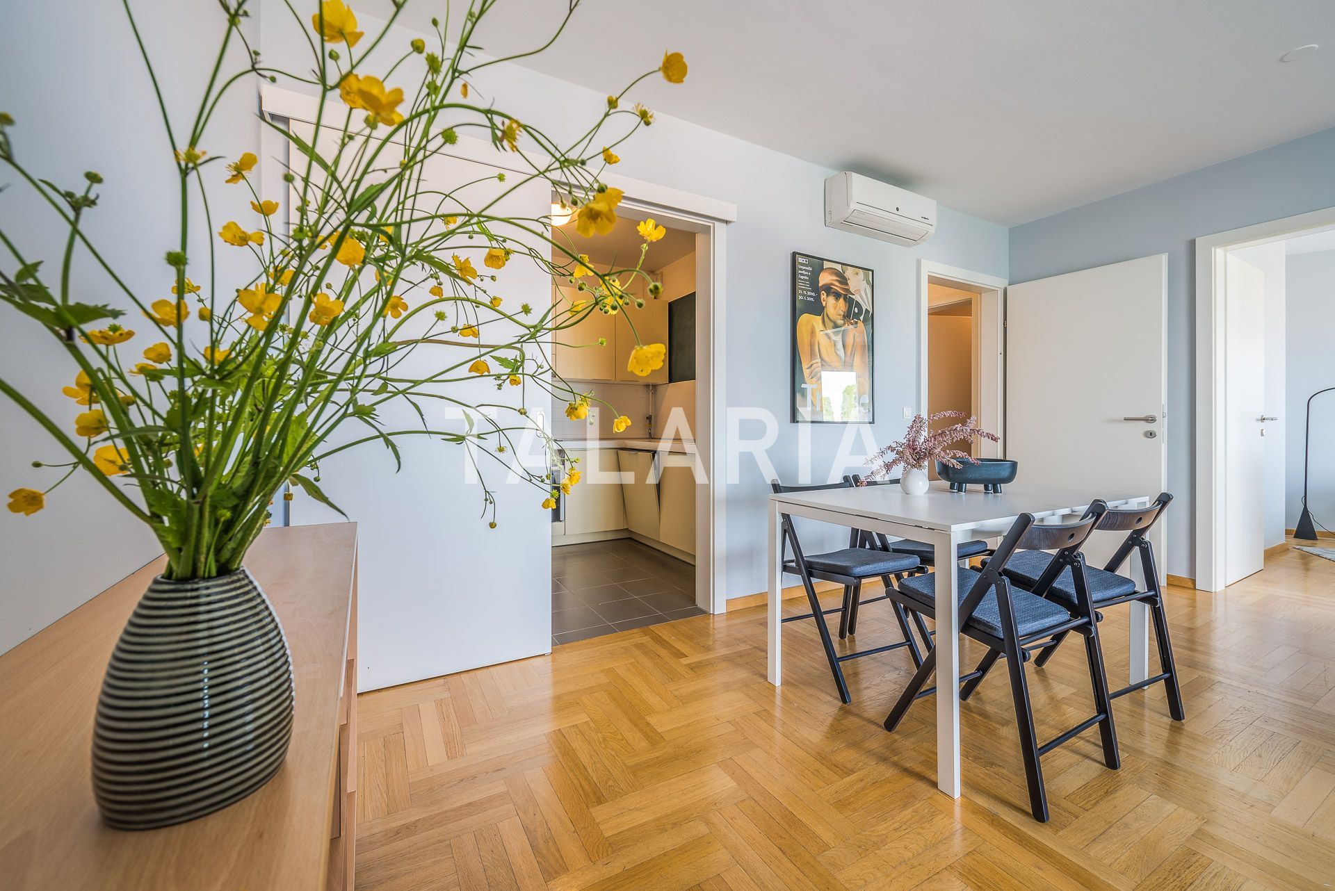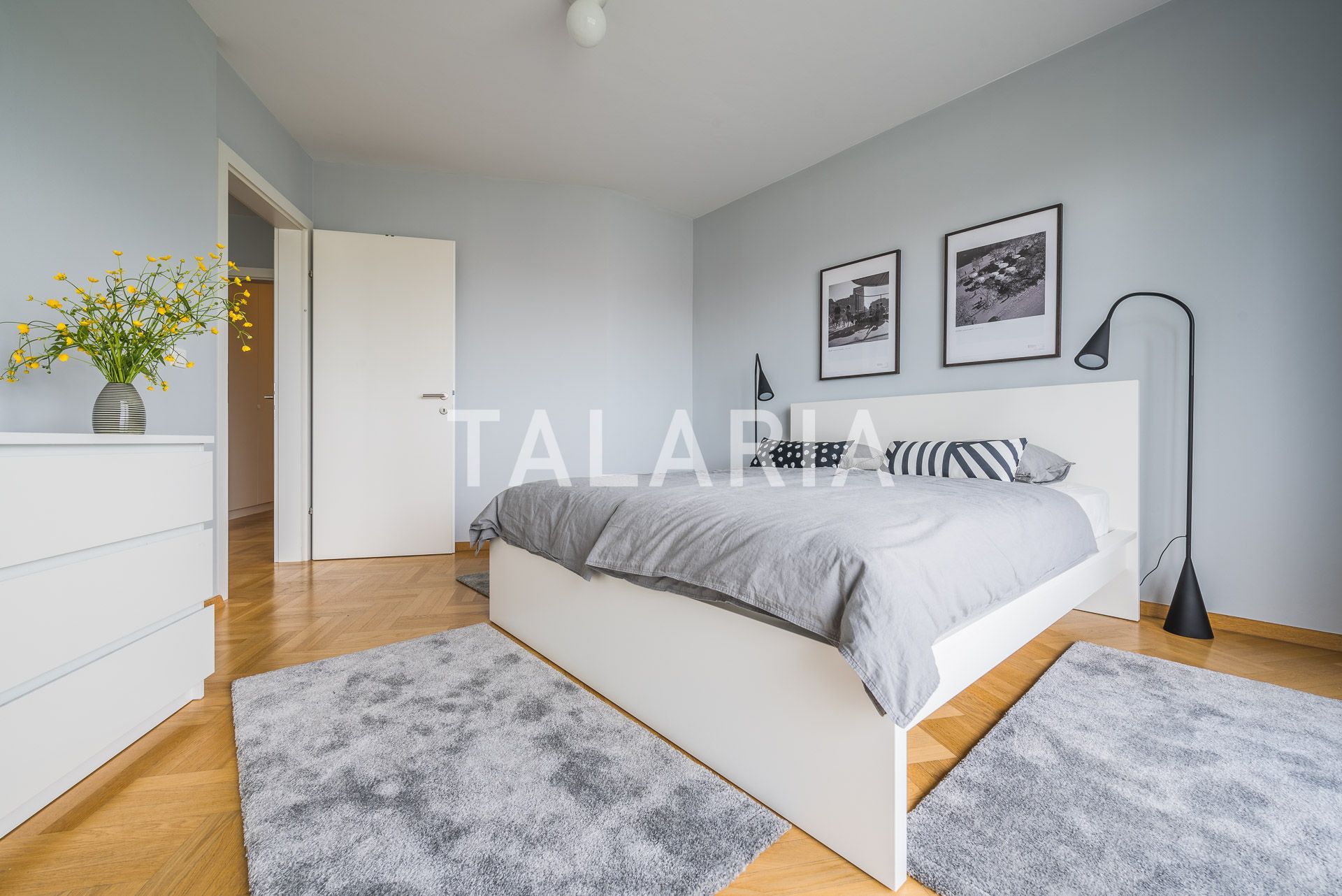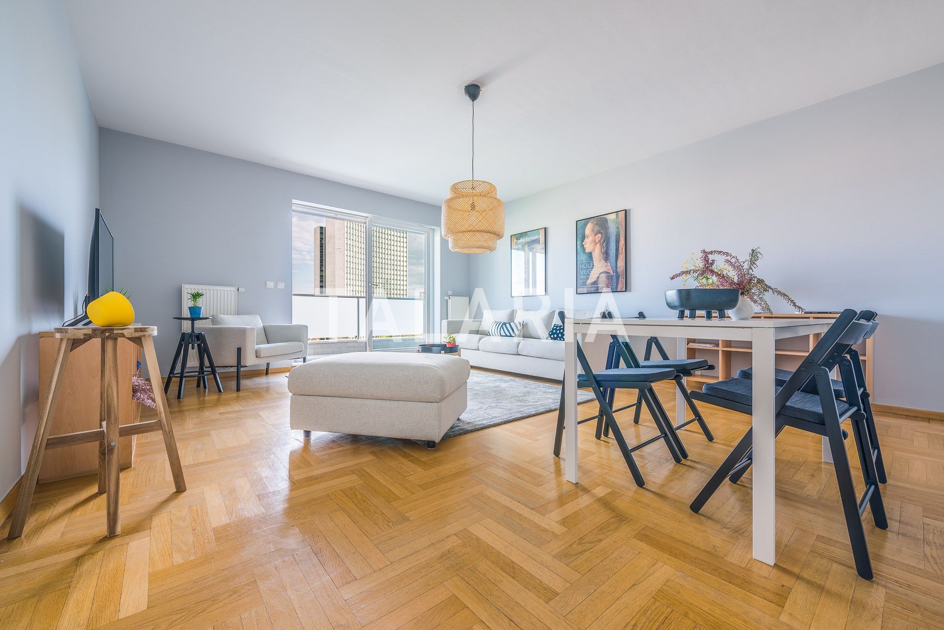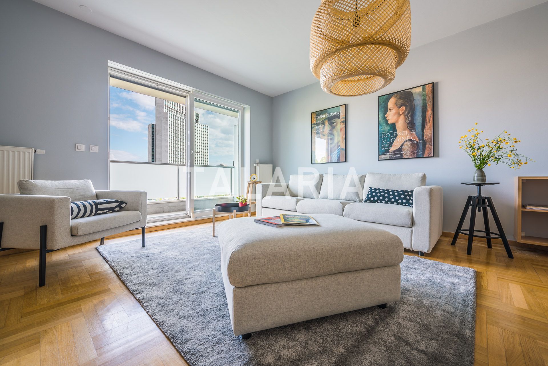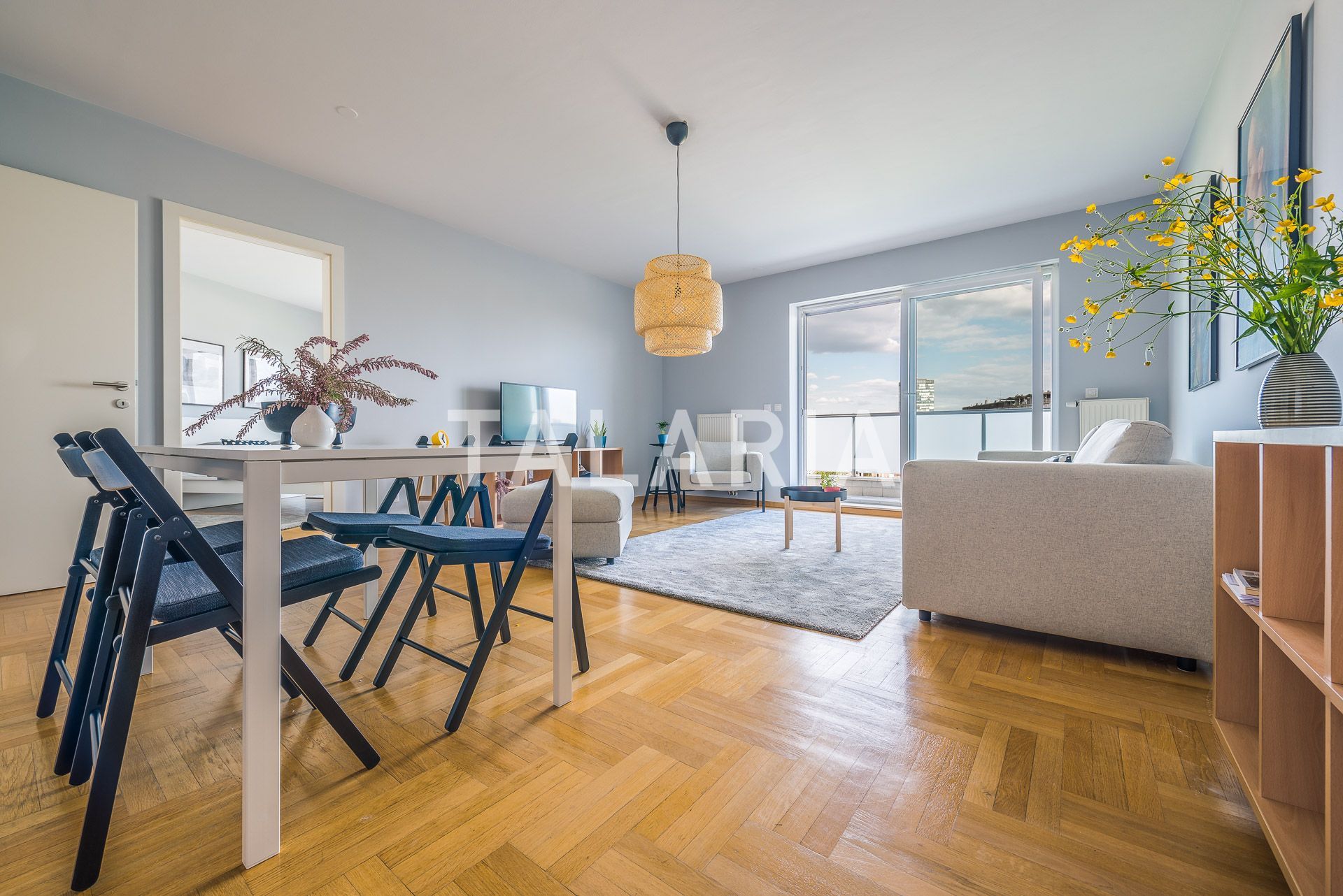 Odličan dvosoban stan tlocrtne površine 75,61 m2 (NKP 68,18 m2) s urbanim pogledom na neboder Zagrepčanke. Stan se sastoji od ulaznog hola s ugradbenim ormarima, prostrane spavaće sobe s izlazom na terasu, velikog i svijetlog dnevnog boravka s blagovaonom, odvojene odlično opremljene kuhinje te kupaone s kadom. Moderno je namješten, potpuno novim namještajem. Pripada mu garažno parkirno mjesto u zgradi od 12,57 m2 (NKP 9,43 m2) te spremište 4,42 m2 (NKP 2,21 m2). Stan je zajedno s garažnim parkirnim mjestom i spremištem ukupne tlocrtne površine 92,60 m2 (ukupne neto korisne površine 79,82 m2). Moderna i kvalitetna zgrada. Super lokacija, blizu centra grada. Preporuka agencije!!