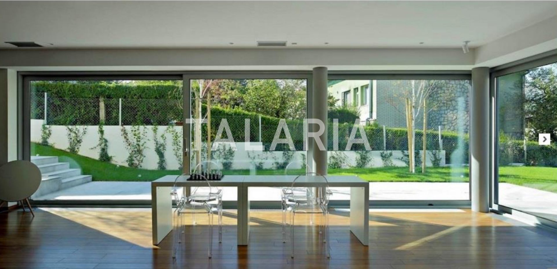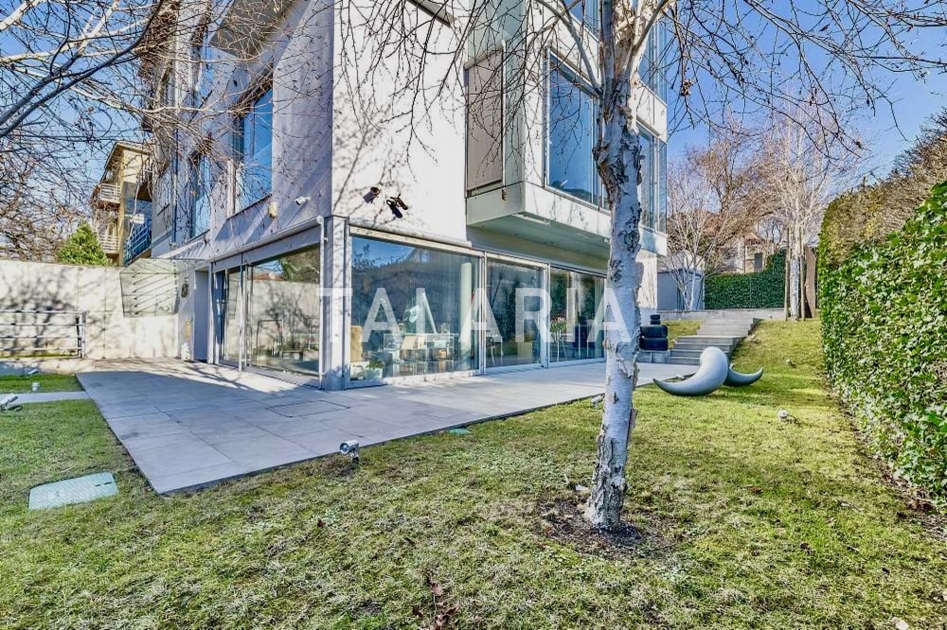 Prizemlje čini ulazni hodnik s ugradbenim ormarima, prostrani dnevni boravk koji je zapravo study room ili soba za sastanke s velikom staklenom stijenom koja se otvara na lijeepi ravni vrt idealan za prijeme, tehničkih prostorija te lifta.